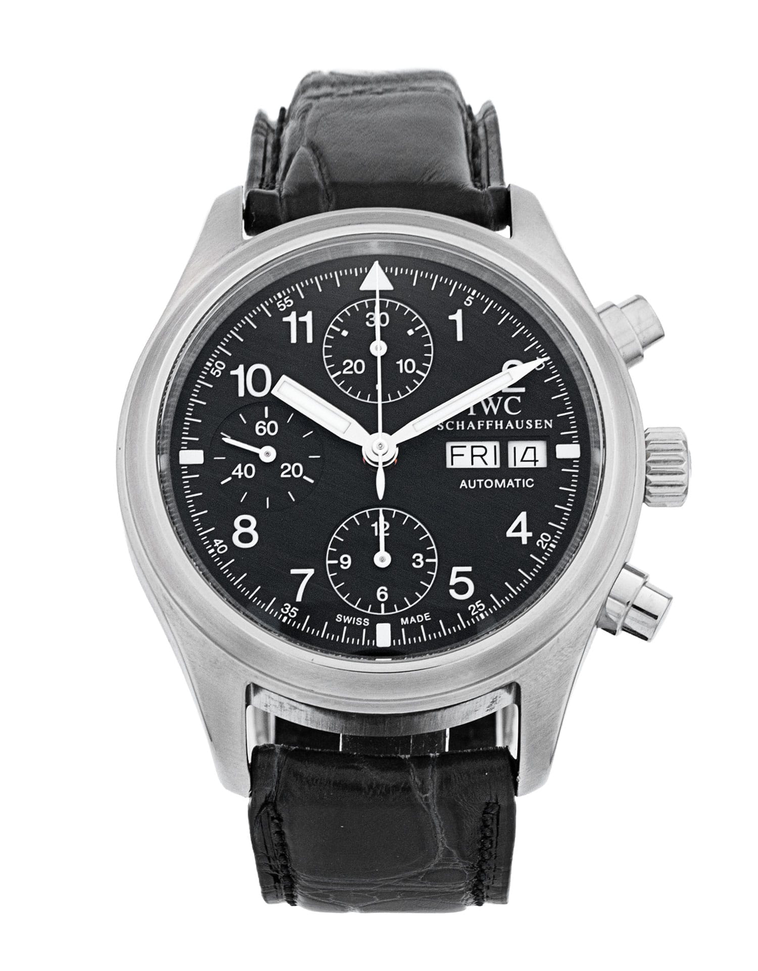 This IWC Pilot's Chrono IW370603 has a black arabic dial and a leather strap. This IWC has undergone a thorough inspection of accuracy, functionality and condition at our IWC certified service centre to determine the level of reconditioning required to meet our strict standards. It has also been checked against our records to ensure authenticity. All our watches have a 24-month warranty for your peace of mind.