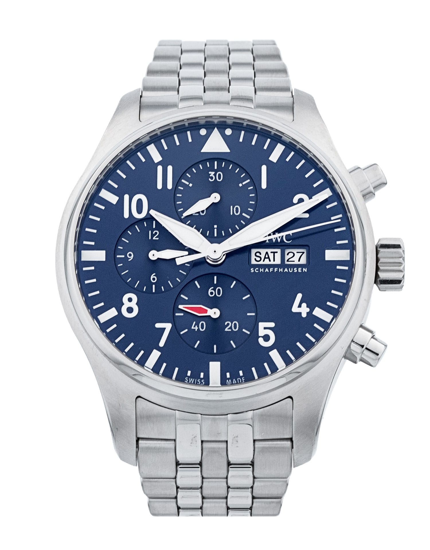 This IWC Pilot's Chrono IW378004 has a blue arabic dial and a bracelet strap. This IWC has undergone a thorough inspection of accuracy, functionality and condition at our IWC certified service centre to determine the level of reconditioning required to meet our strict standards. It has also been checked against our records to ensure authenticity. All our watches have a 24-month warranty for your peace of mind.