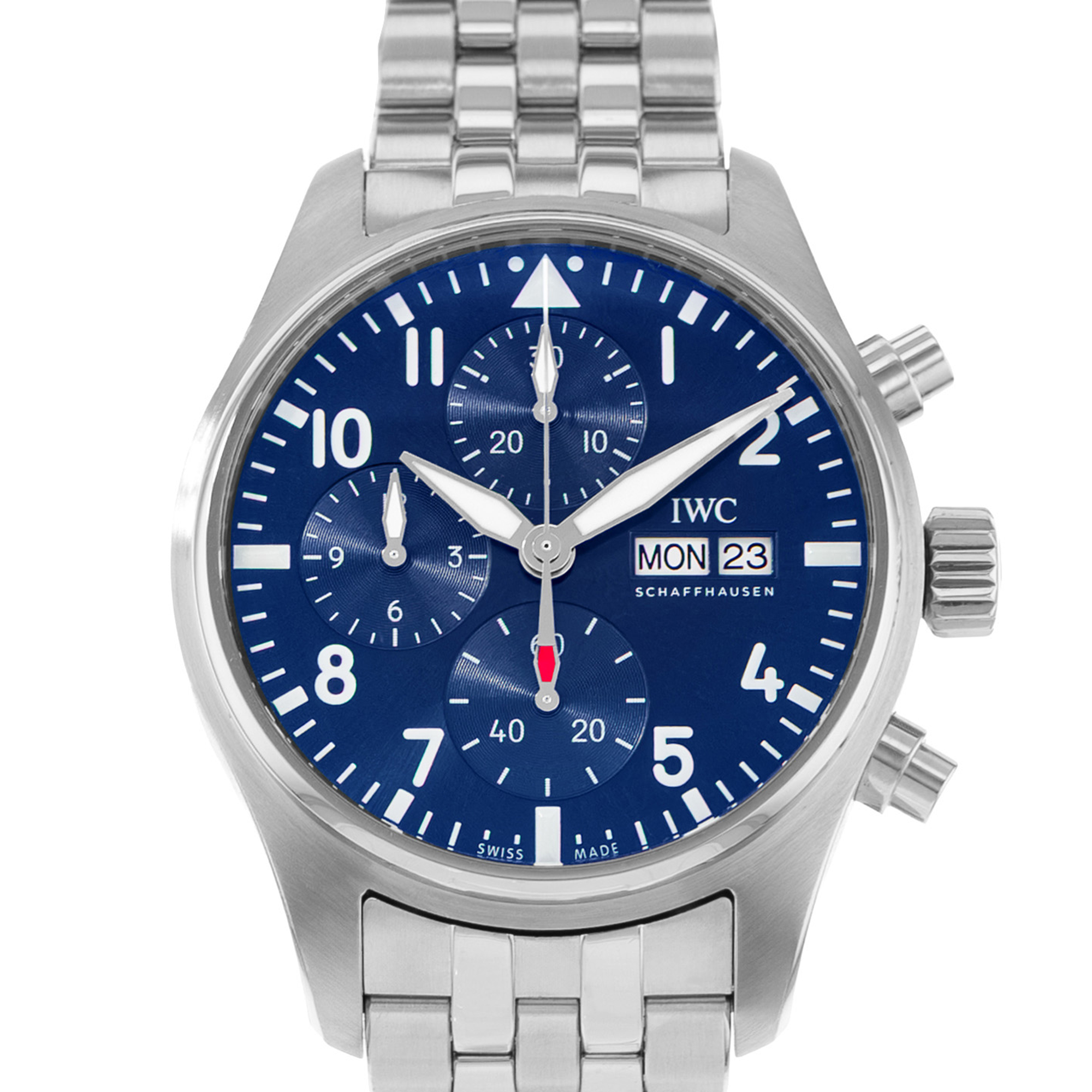 This IWC Pilot's Chrono IW388102 has a blue arabic dial and a bracelet strap. This IWC has undergone a thorough inspection of accuracy, functionality and condition at our IWC certified service centre to determine the level of reconditioning required to meet our strict standards. It has also been checked against our records to ensure authenticity. All our watches have a 24-month warranty for your peace of mind.