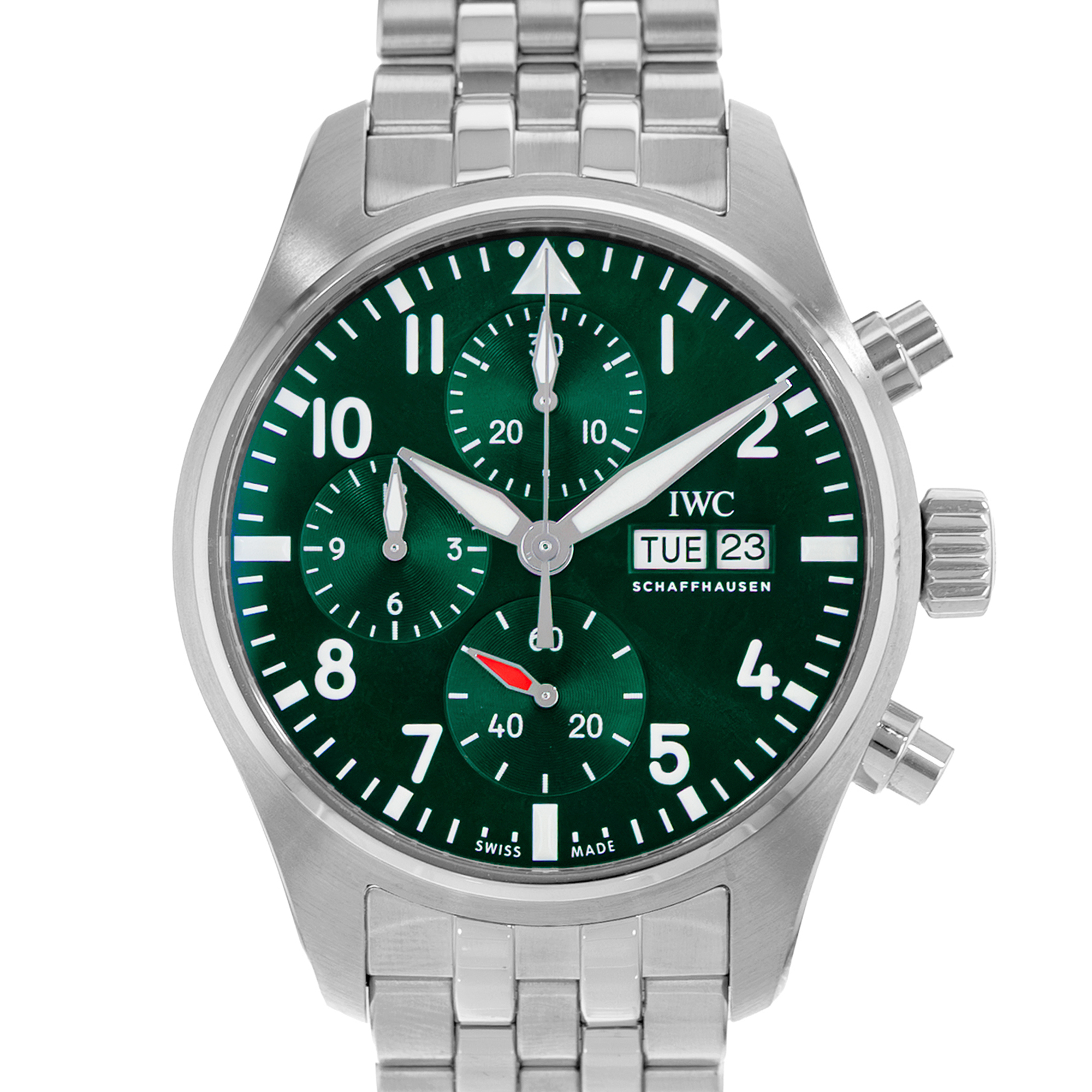 This IWC Pilot's Chrono IW388104 has a green arabic dial and a bracelet strap. This IWC has undergone a thorough inspection of accuracy, functionality and condition at our IWC certified service centre to determine the level of reconditioning required to meet our strict standards. It has also been checked against our records to ensure authenticity. Our watches have a 24-month warranty for your peace of mind, in conjunction with any remaining manufacturer’s warranty from new or from service.