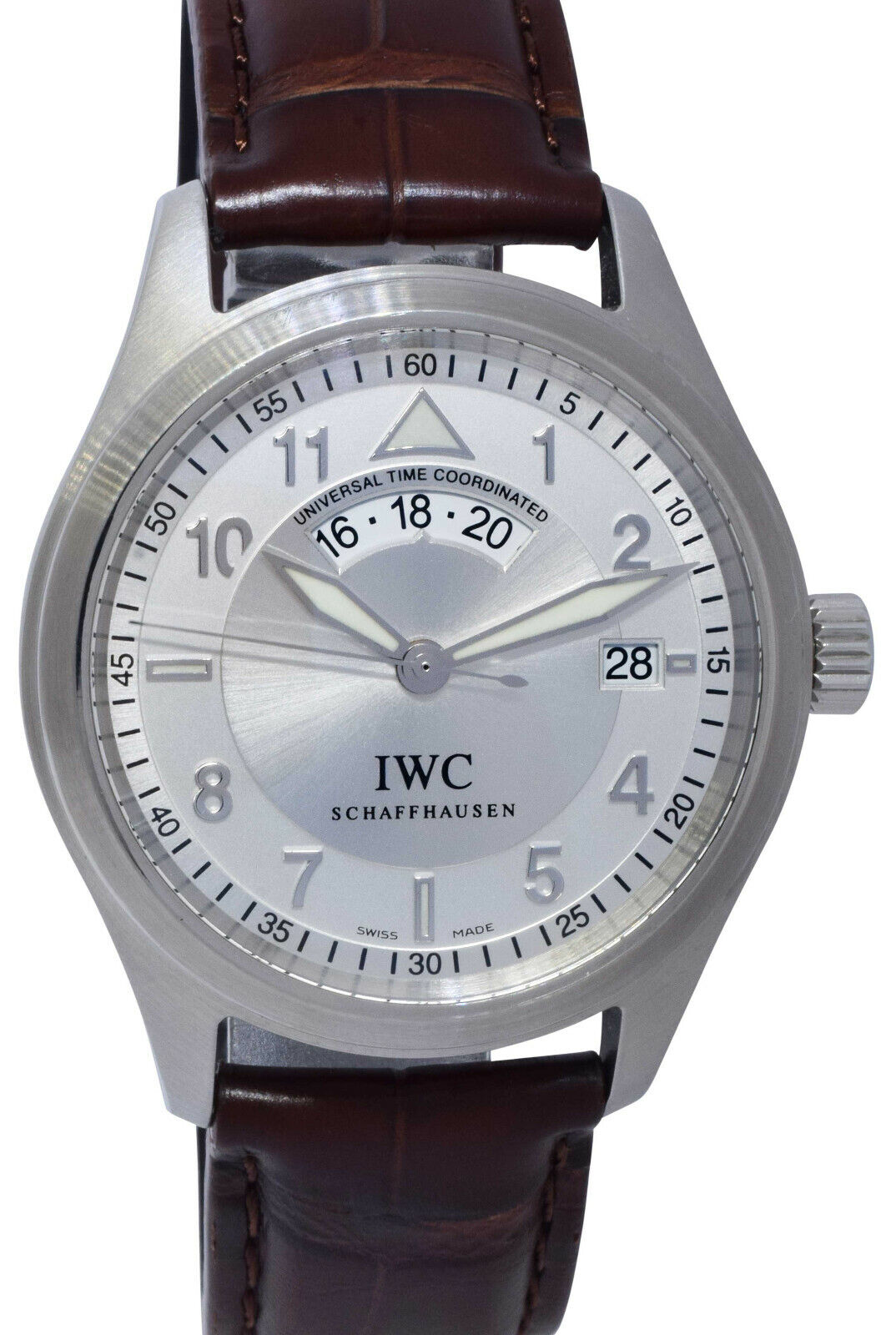 This IWC Pilot's UTC IW325107 has a silver arabic dial and a leather strap. This IWC has undergone a thorough inspection of accuracy, functionality and condition at our IWC certified service centre to determine the level of reconditioning required to meet our strict standards. It has also been checked against our records to ensure authenticity. All our watches have a 24-month warranty for your peace of mind.