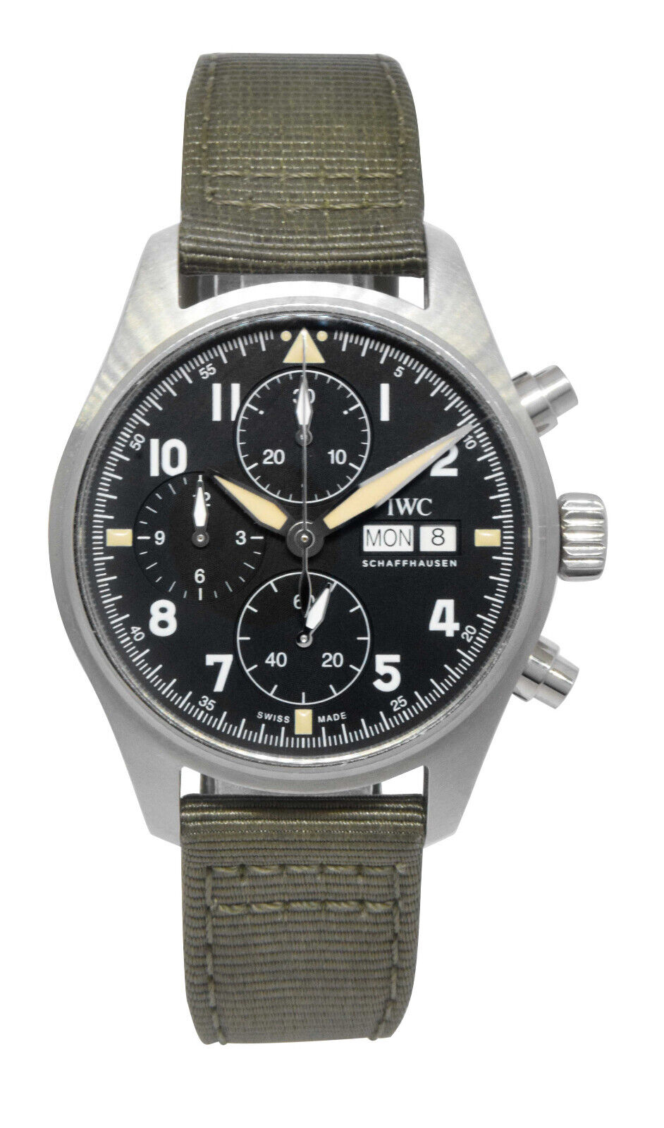 This IWC Pilot's Spitfire IW387901 has a black arabic dial and a fabric strap. This IWC has undergone a thorough inspection of accuracy, functionality and condition at our IWC certified service centre to determine the level of reconditioning required to meet our strict standards. It has also been checked against our records to ensure authenticity. All our watches have a 24-month warranty for your peace of mind.