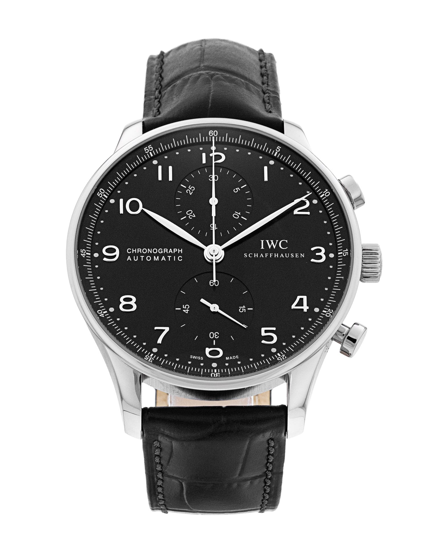 This IWC Portugieser Chrono IW371438 has a black arabic dial and a leather strap. This IWC has undergone a thorough inspection of accuracy, functionality and condition at our IWC certified service centre to determine the level of reconditioning required to meet our strict standards. It has also been checked against our records to ensure authenticity. All our watches have a 24-month warranty for your peace of mind.