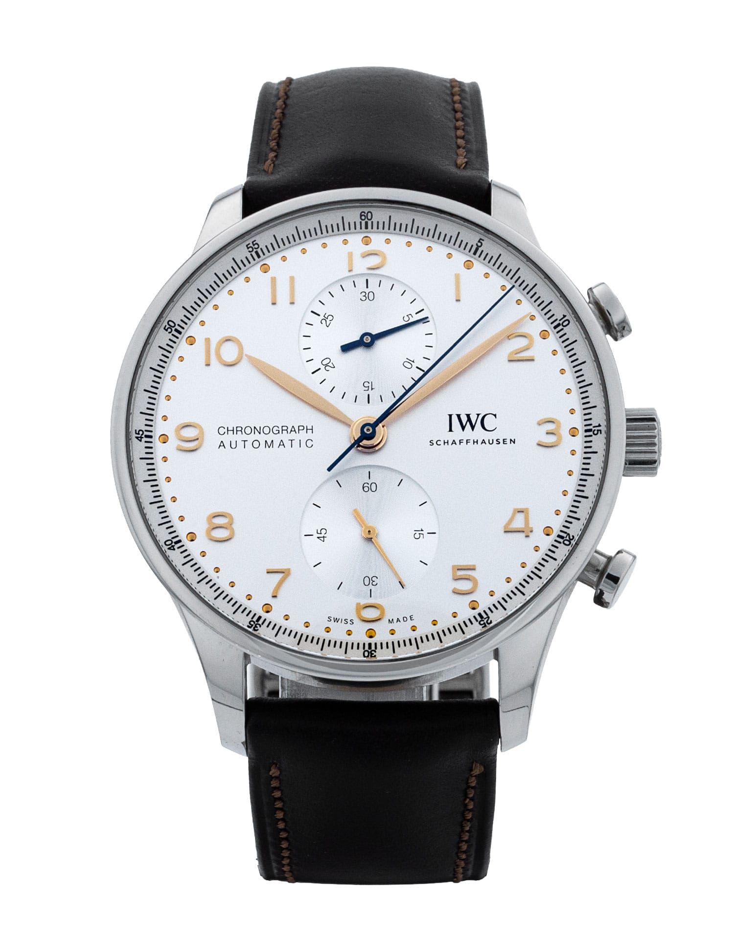 This IWC Portugieser Chrono IW371604 has a silver arabic dial and a leather strap. This IWC has undergone a thorough inspection of accuracy, functionality and condition at our IWC certified service centre to determine the level of reconditioning required to meet our strict standards. It has also been checked against our records to ensure authenticity. Our watches have a 24-month warranty for your peace of mind, in conjunction with any remaining manufacturer’s warranty from new or from service.