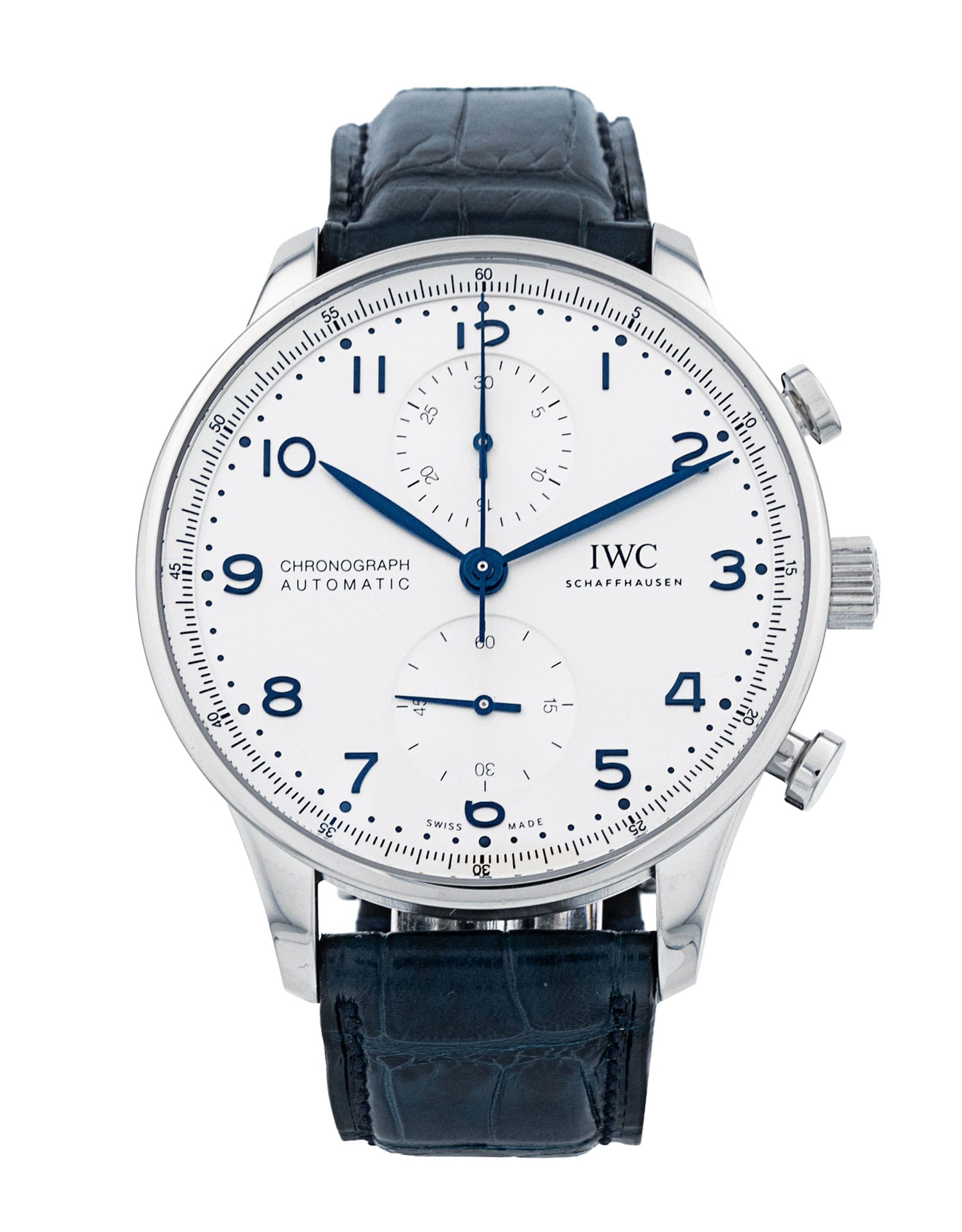 This IWC Portugieser Chrono IW371605 has a silver arabic dial and a leather strap. This IWC has undergone a thorough inspection of accuracy, functionality and condition at our IWC certified service centre to determine the level of reconditioning required to meet our strict standards. It has also been checked against our records to ensure authenticity. Our watches have a 24-month warranty for your peace of mind, in conjunction with any remaining manufacturer’s warranty from new or from service.