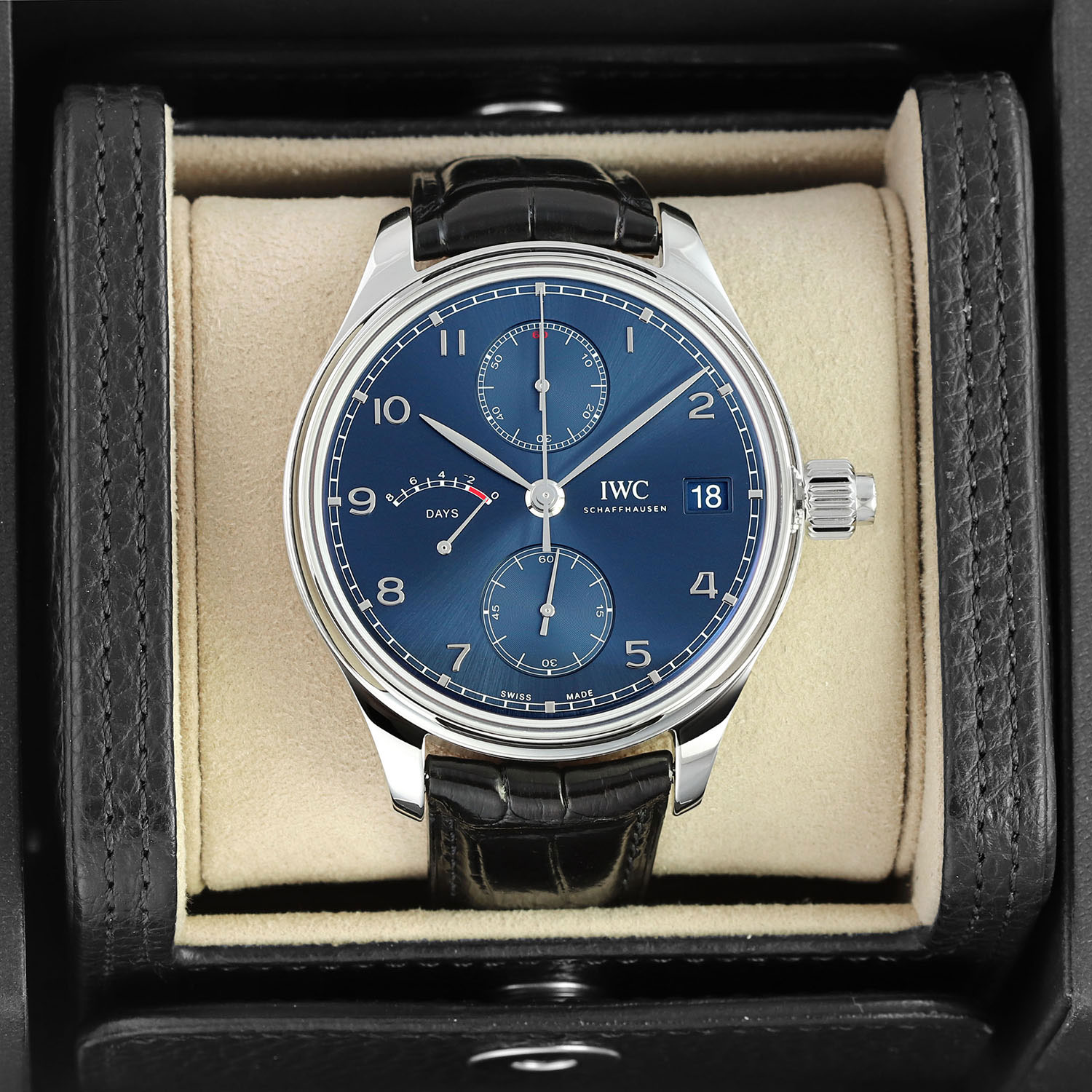 This IWC Portugieser Hand-Wound IW515301 has a blue arabic dial and a leather strap. This IWC has undergone a thorough inspection of accuracy, functionality and condition at our IWC certified service centre to determine the level of reconditioning required to meet our strict standards. It has also been checked against our records to ensure authenticity. All our watches have a 24-month warranty for your peace of mind.