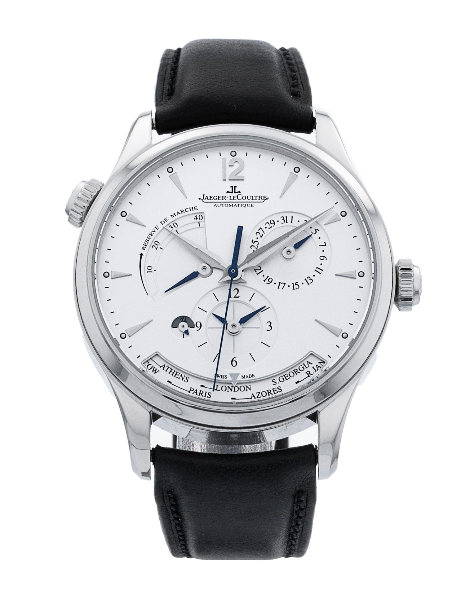 This Jaeger-LeCoultre Master Geographic 1428421 has a silver baton dial and a leather strap. This Jaeger-LeCoultre has undergone a thorough inspection of accuracy, functionality and condition at our Jaeger-LeCoultre certified service centre to determine the level of reconditioning required to meet our strict standards. It has also been checked against our records to ensure authenticity. All our watches have a 24-month warranty for your peace of mind.