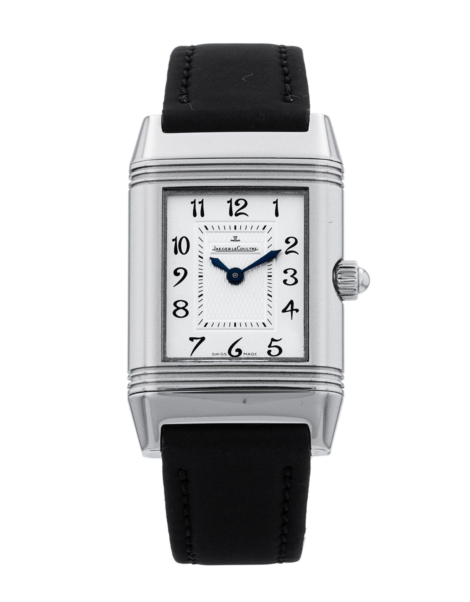 This Jaeger-LeCoultre Reverso Duetto 2668410 has a silver arabic dial and a leather strap. This Jaeger-LeCoultre has undergone a thorough inspection of accuracy, functionality and condition at our Jaeger-LeCoultre certified service centre to determine the level of reconditioning required to meet our strict standards. It has also been checked against our records to ensure authenticity. All our watches have a 24-month warranty for your peace of mind.