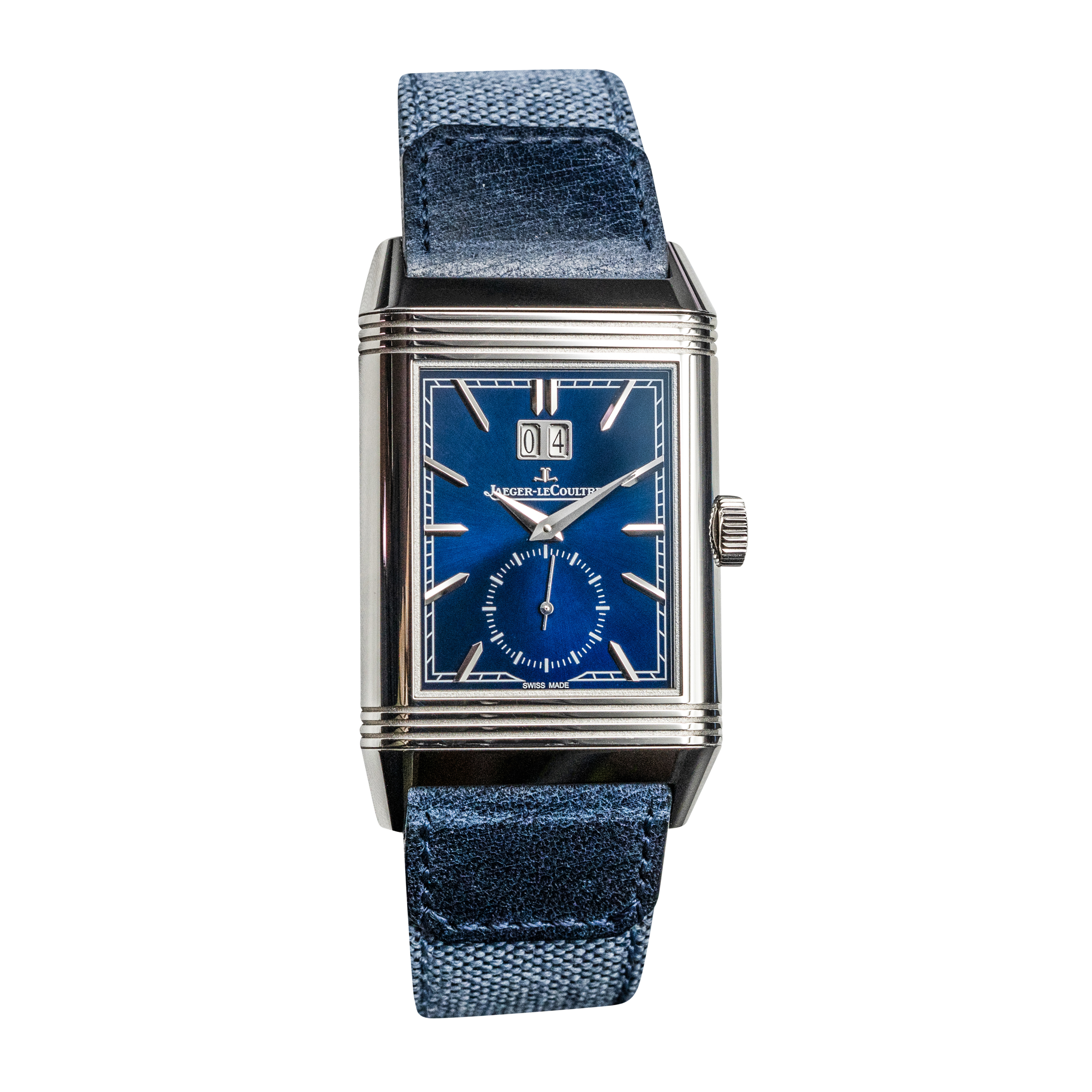 This Jaeger-LeCoultre Reverso Tribute Duoface Q714845J has a blue baton dial and a leather strap. This Jaeger-LeCoultre has undergone a thorough inspection of accuracy, functionality and condition at our Jaeger-LeCoultre certified service centre to determine the level of reconditioning required to meet our strict standards. It has also been checked against our records to ensure authenticity. Our watches have a 24-month warranty for your peace of mind, in conjunction with any remaining manufacturer’s warranty from new or from service.
