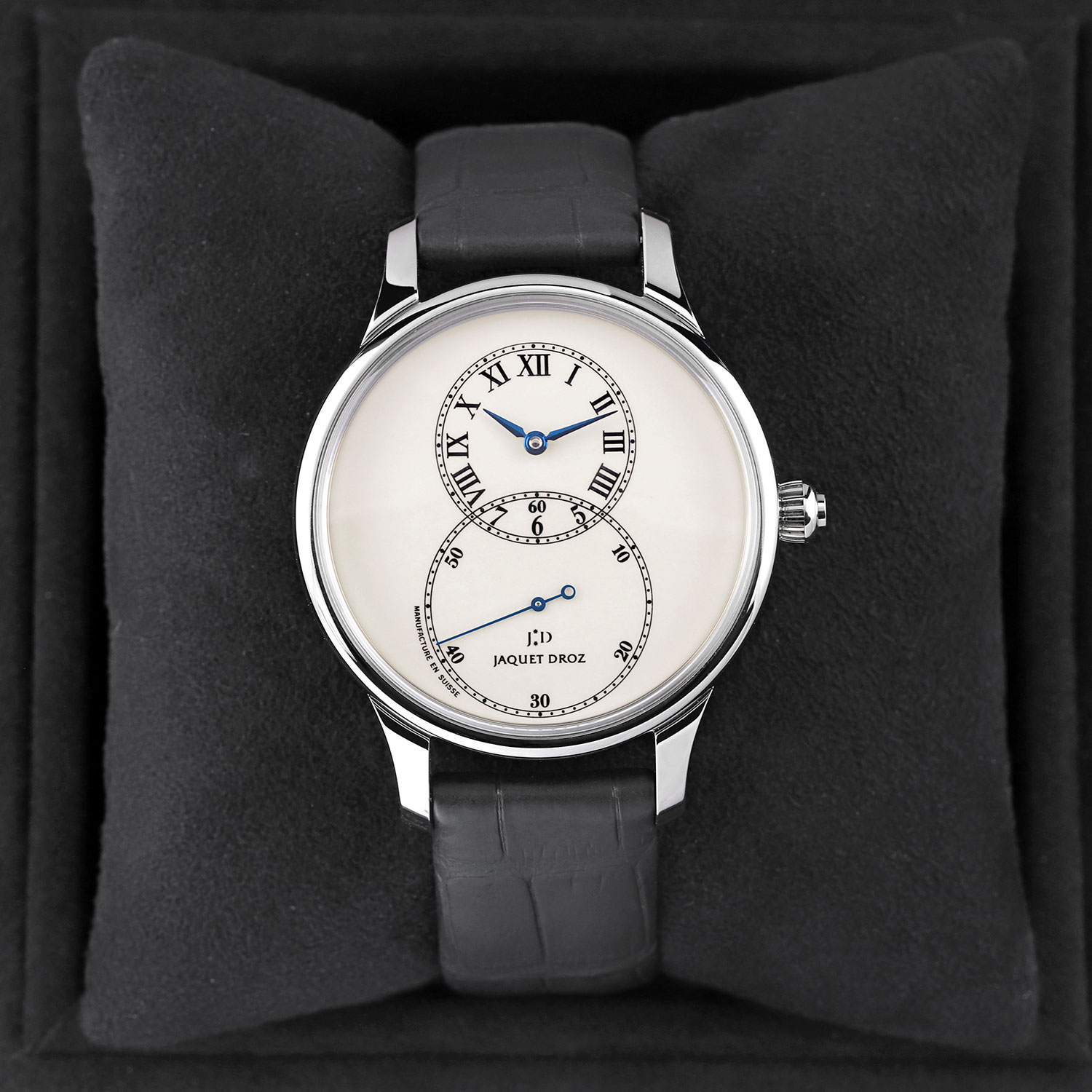 This Jaquet Droz Grande Seconde J014014201 has a ivory dial and a leather strap. This Jaquet Droz has undergone a thorough inspection of water resistance, accuracy, functionality and condition to determine the level of reconditioning required to meet our strict standards. It has also been referenced against technical documents and manufacturer records where available to ensure authenticity and a clean history. All our watches have a 24-month warranty for your peace of mind.