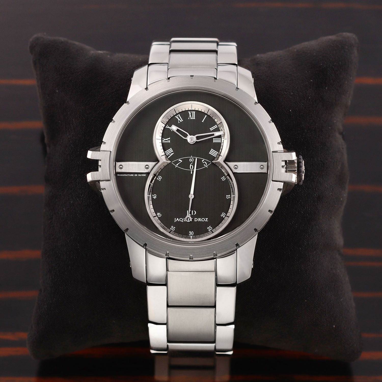 This Jaquet Droz Grande Seconde J029030148 has a black dial and a bracelet strap. This Jaquet Droz has undergone a thorough inspection of water resistance, accuracy, functionality and condition to determine the level of reconditioning required to meet our strict standards. It has also been referenced against technical documents and manufacturer records where available to ensure authenticity and a clean history. Our watches have a 24-month warranty for your peace of mind, in conjunction with any remaining manufacturer’s warranty from new or from service.