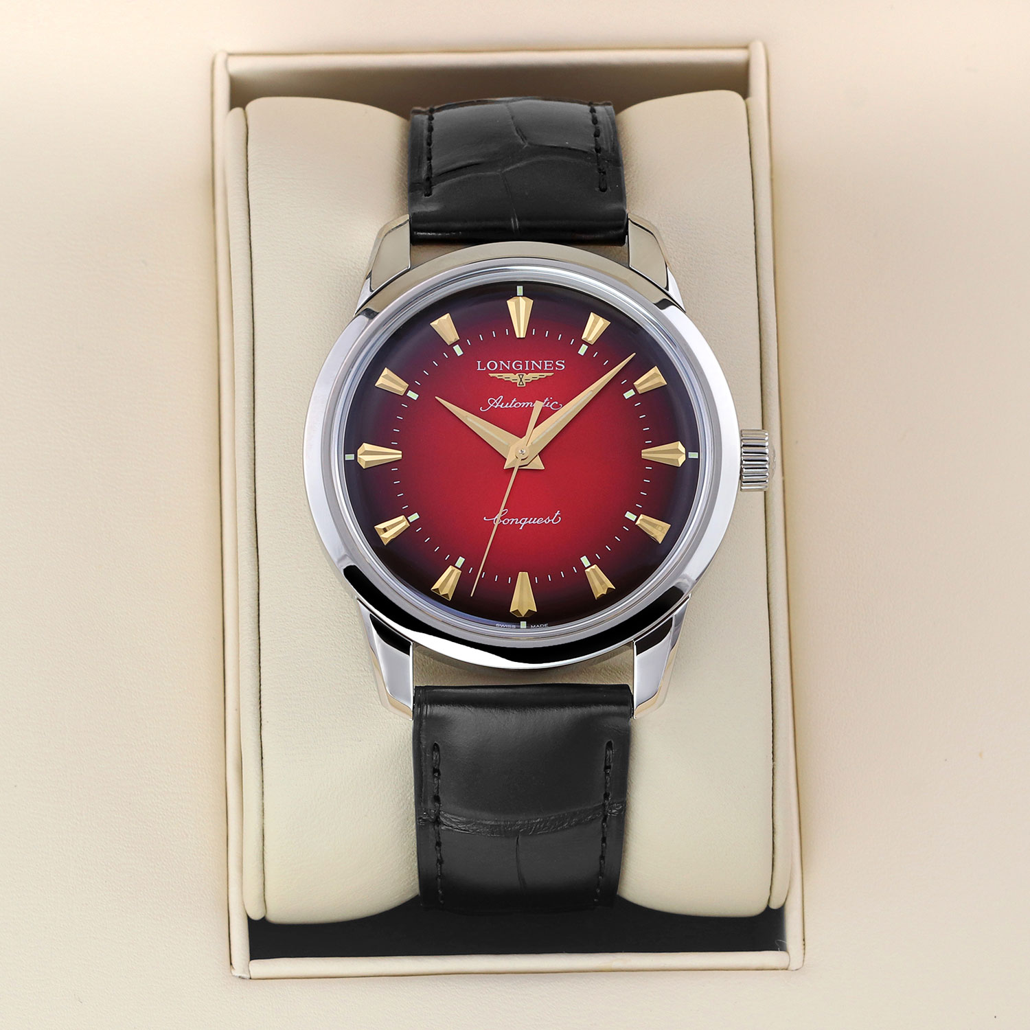 This Longines Conquest L1.651.4.09.2 has a red dial and a leather strap. This Longines has undergone a thorough inspection of accuracy, functionality and condition at our Longines certified service centre to determine the level of reconditioning required to meet our strict standards. It has also been checked against our records to ensure authenticity. Our watches have a 24-month warranty for your peace of mind, in conjunction with any remaining manufacturer’s warranty from new or from service.