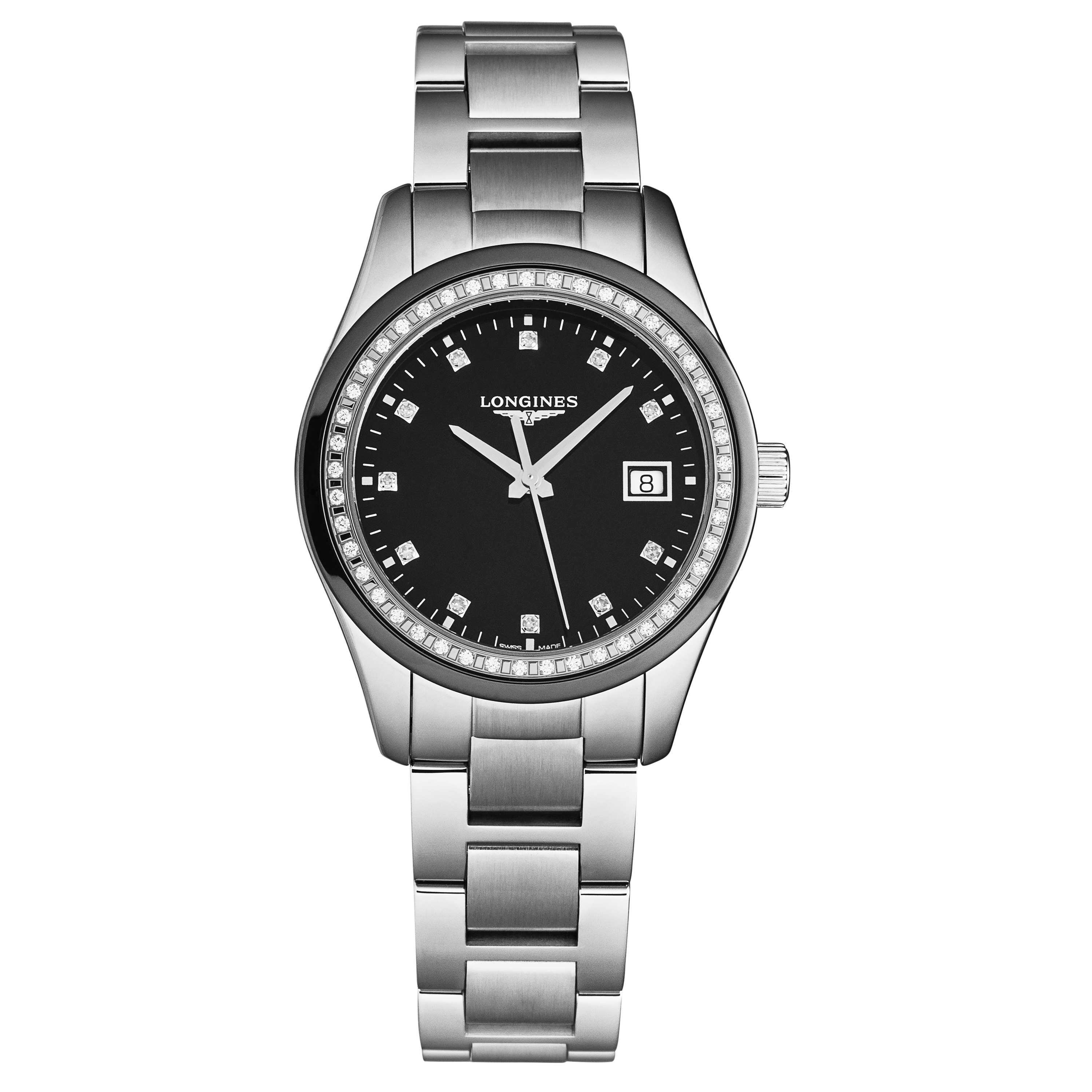 This Longines Conquest L2.387.0.57.6 has a black diamond dial and a bracelet strap. This Longines has undergone a thorough inspection of accuracy, functionality and condition at our Longines certified service centre to determine the level of reconditioning required to meet our strict standards. It has also been checked against our records to ensure authenticity. All our watches have a 24-month warranty for your peace of mind.