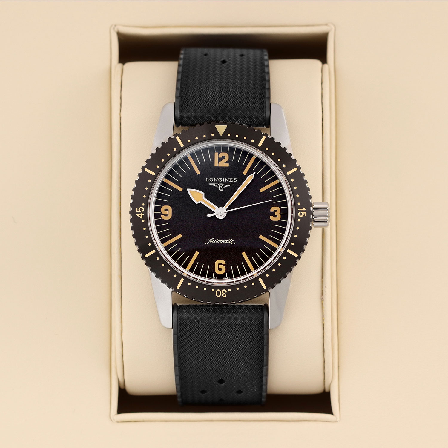 This Longines Heritage L2.822.4.56.9 has a black quarter arabic dial and a rubber strap. This Longines has undergone a thorough inspection of accuracy, functionality and condition at our Longines certified service centre to determine the level of reconditioning required to meet our strict standards. It has also been checked against our records to ensure authenticity. All our watches have a 24-month warranty for your peace of mind.