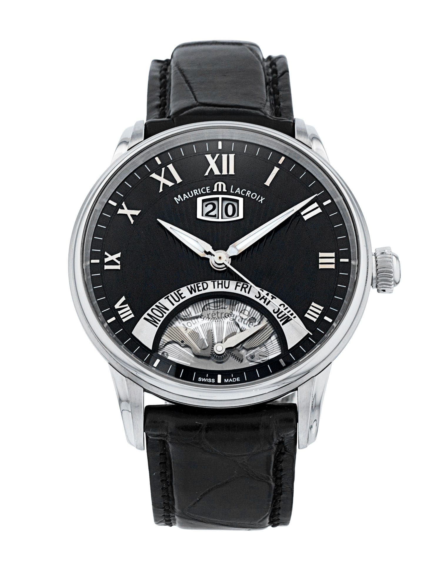 This Maurice Lacroix Masterpiece MP6358-SS001-31E has a black roman numeral dial and a leather strap. This Maurice Lacroix has undergone a thorough inspection of water resistance, accuracy, functionality and condition to determine the level of reconditioning required to meet our strict standards. It has also been referenced against technical documents and manufacturer records where available to ensure authenticity and a clean history. All our watches have a 24-month warranty for your peace of mind.