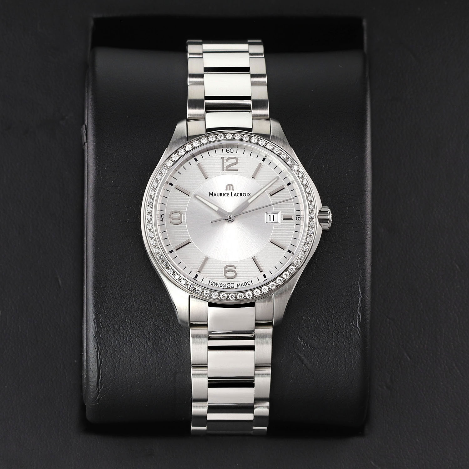 This Maurice Lacroix Miros Collection MI1014-SD502-130 has a silver quarter arabic dial and a bracelet strap. This Maurice Lacroix has undergone a thorough inspection of water resistance, accuracy, functionality and condition to determine the level of reconditioning required to meet our strict standards. It has also been referenced against technical documents and manufacturer records where available to ensure authenticity and a clean history. All our watches have a 24-month warranty for your peace of mind.
