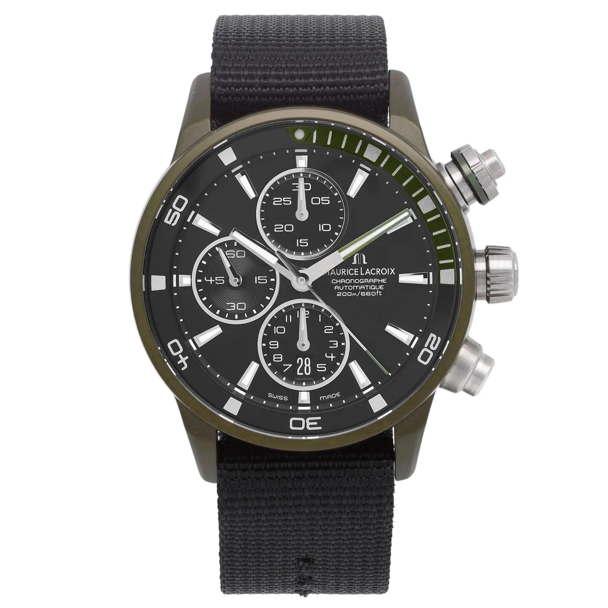 This Maurice Lacroix Pontos S Extreme PT6028-ALB21-331 has a black dial and a fabric strap. This Maurice Lacroix has undergone a thorough inspection of water resistance, accuracy, functionality and condition to determine the level of reconditioning required to meet our strict standards. It has also been referenced against technical documents and manufacturer records where available to ensure authenticity and a clean history. All our watches have a 24-month warranty for your peace of mind.
