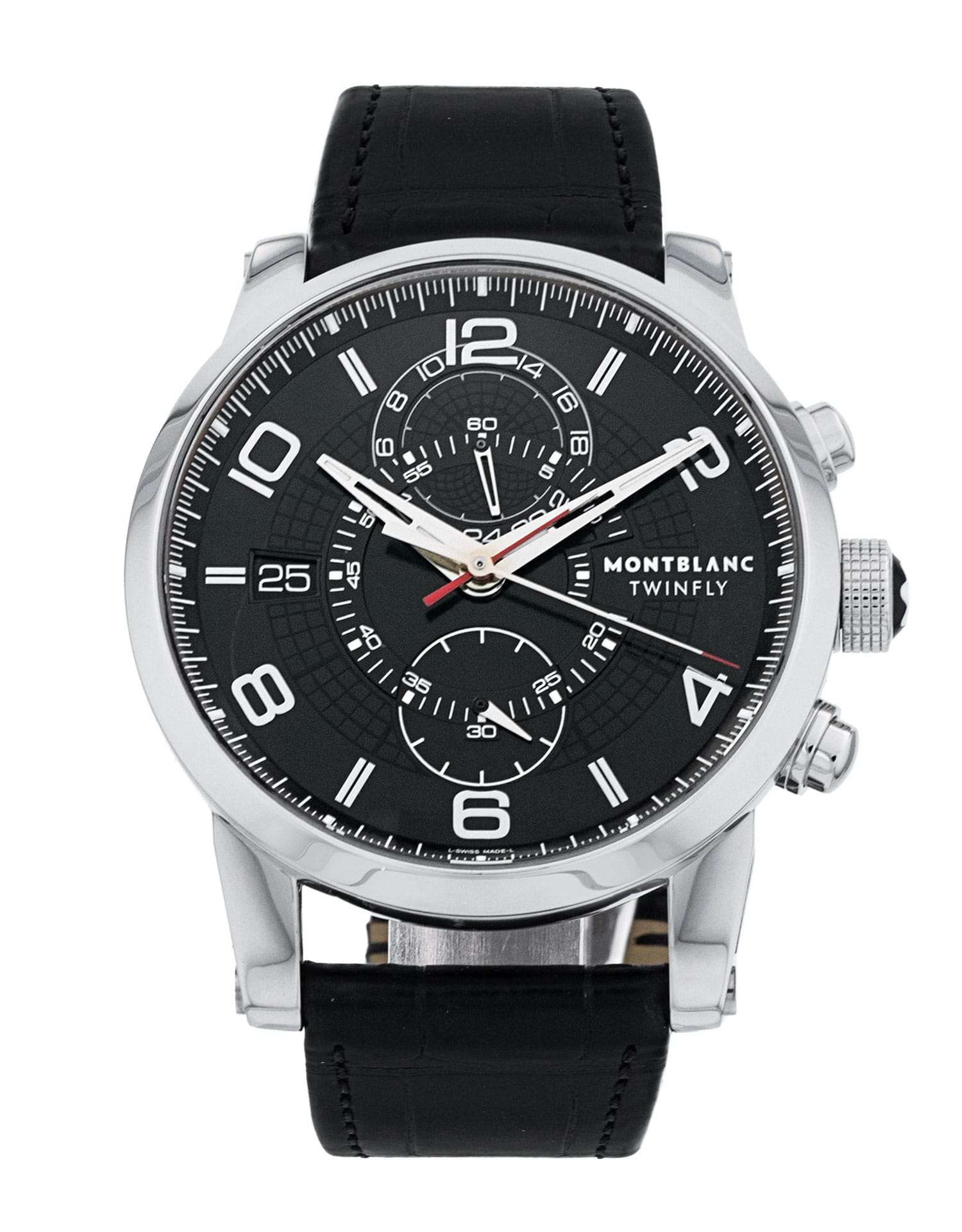 This Montblanc TimeWalker 105077 has a black arabic dial and a leather strap. This Montblanc has undergone a thorough inspection of water resistance, accuracy, functionality and condition to determine the level of reconditioning required to meet our strict standards. It has also been referenced against technical documents and manufacturer records where available to ensure authenticity and a clean history. All our watches have a 24-month warranty for your peace of mind.