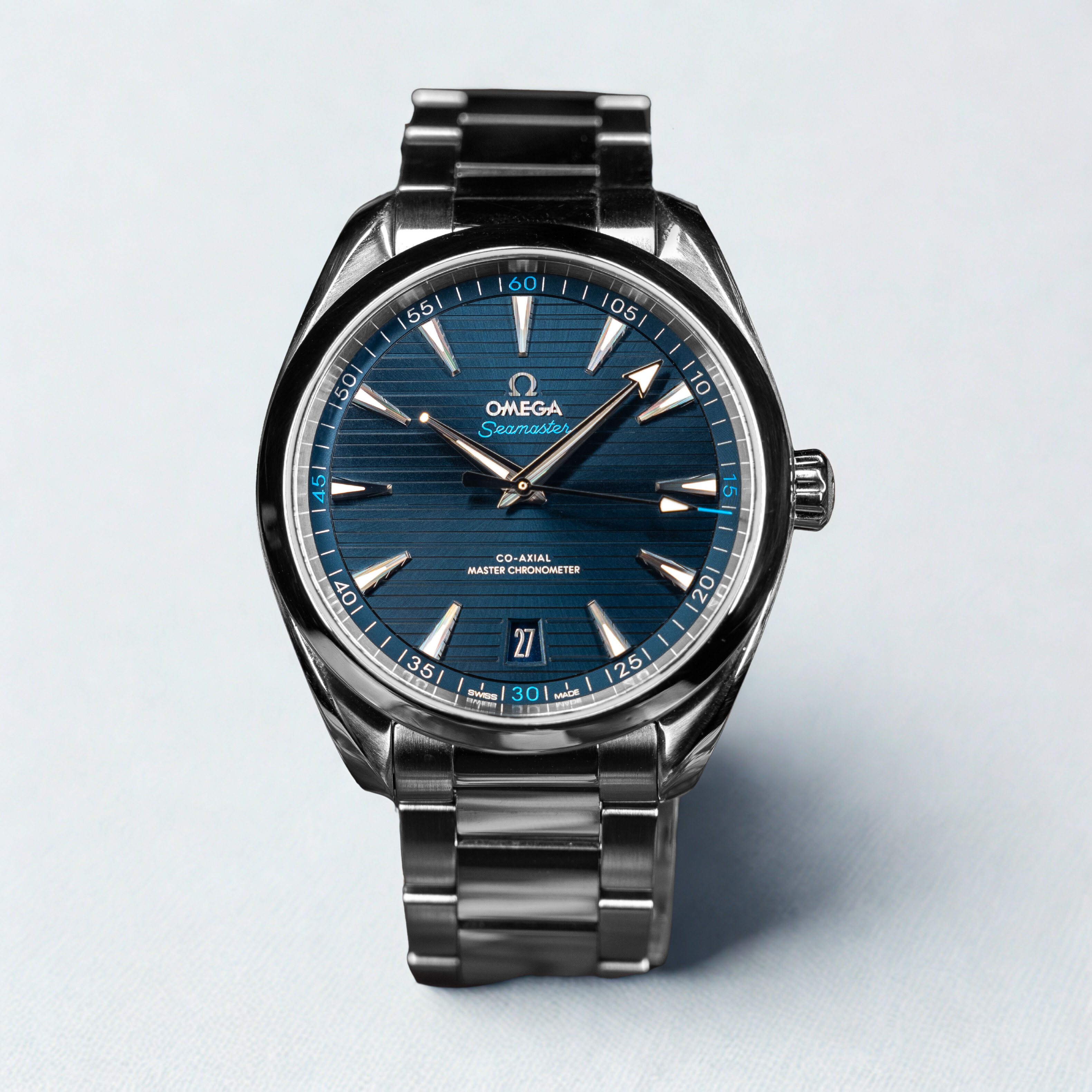 This Omega Aqua Terra 150m Gents 220.10.41.21.03.001 has a blue baton dial and a bracelet strap. This Omega has undergone a thorough inspection of accuracy, functionality and condition at our Omega certified service centre to determine the level of reconditioning required to meet our strict standards. It has also been checked against our records to ensure authenticity. Our watches have a 24-month warranty for your peace of mind, in conjunction with any remaining manufacturer’s warranty from new or from service.