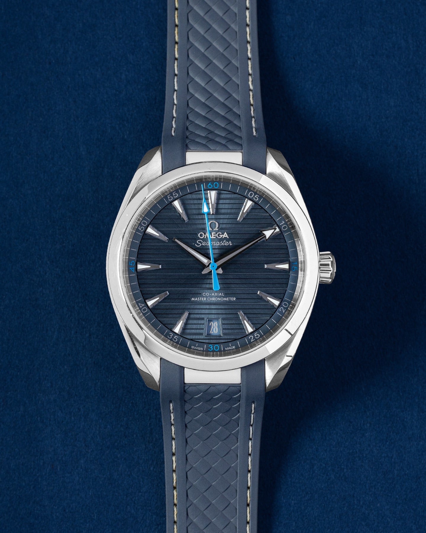 This Omega Aqua Terra 150m Gents 220.12.41.21.03.002 has a blue baton dial and a rubber strap. This Omega has undergone a thorough inspection of accuracy, functionality and condition at our Omega certified service centre to determine the level of reconditioning required to meet our strict standards. It has also been checked against our records to ensure authenticity. All our watches have a 24-month warranty for your peace of mind.
