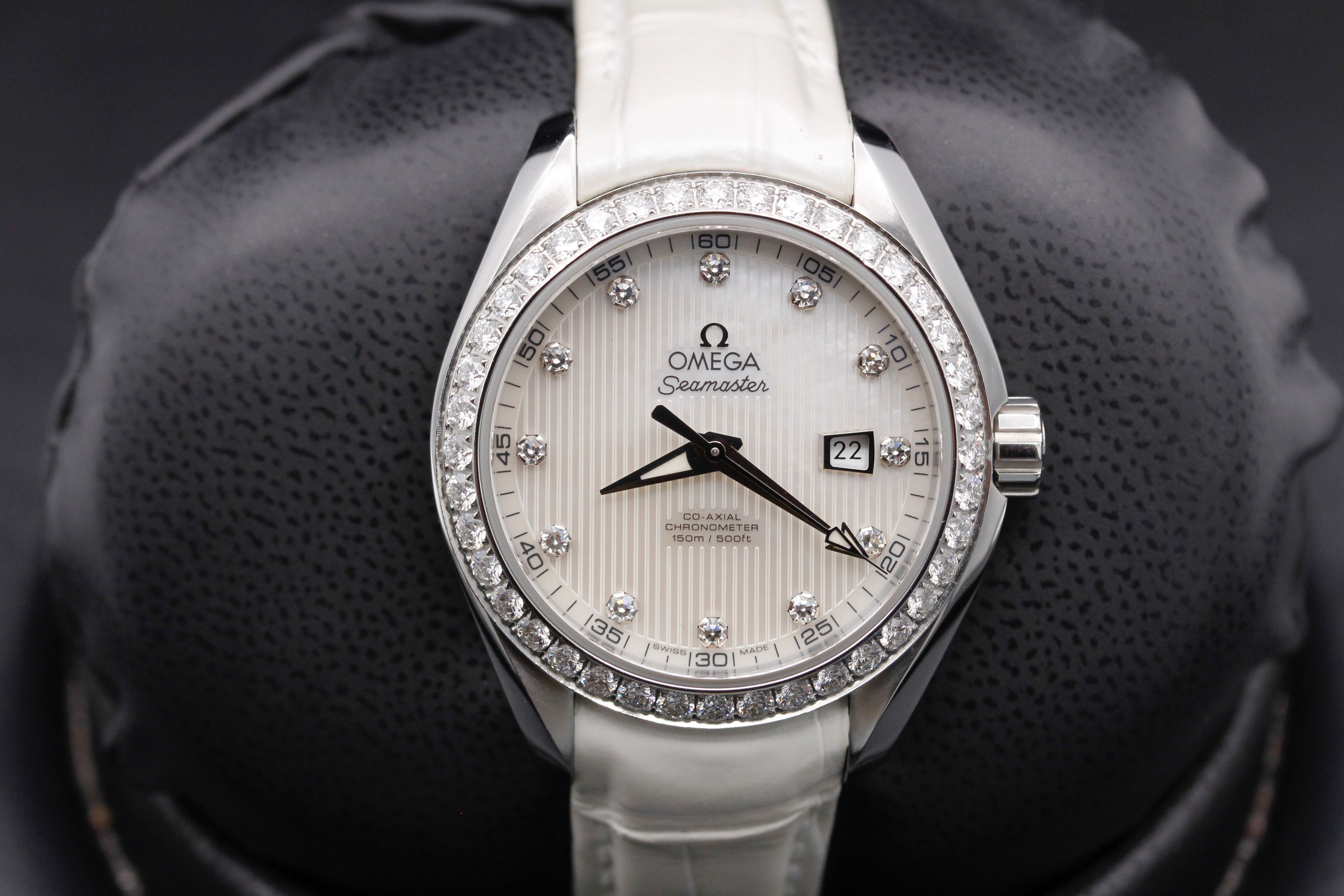 This Omega Aqua Terra 150m Ladies 231.18.30.20.55.001 has a mother of pearl white - diamond dial and a leather strap. This Omega has undergone a thorough inspection of accuracy, functionality and condition at our Omega certified service centre to determine the level of reconditioning required to meet our strict standards. It has also been checked against our records to ensure authenticity. All our watches have a 24-month warranty for your peace of mind.