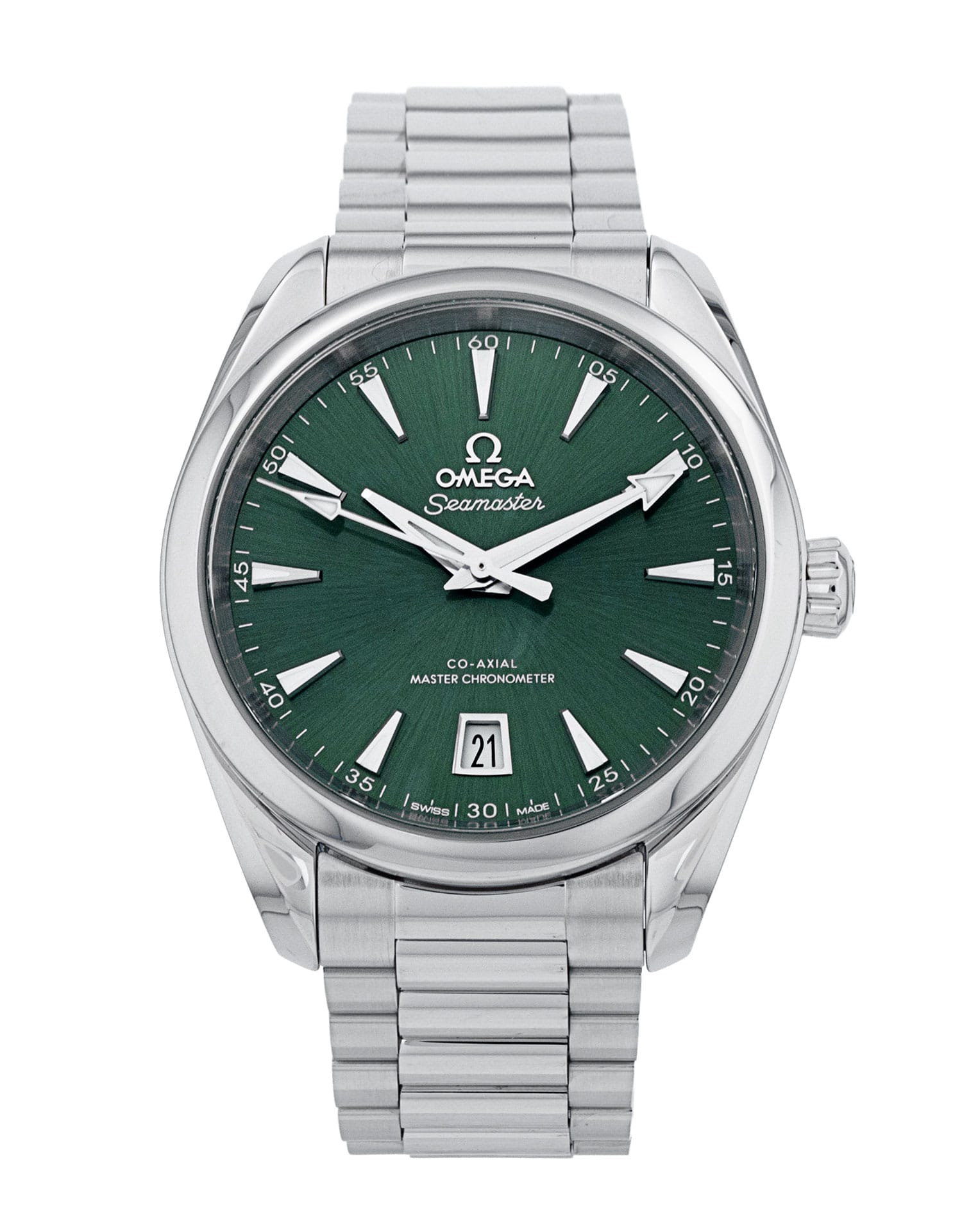 This Omega Aqua Terra Shades 220.10.38.20.10.002 has a green baton dial and a bracelet strap. This Omega has undergone a thorough inspection of accuracy, functionality and condition at our Omega certified service centre to determine the level of reconditioning required to meet our strict standards. It has also been checked against our records to ensure authenticity. Our watches have a 24-month warranty for your peace of mind, in conjunction with any remaining manufacturer’s warranty from new or from service.