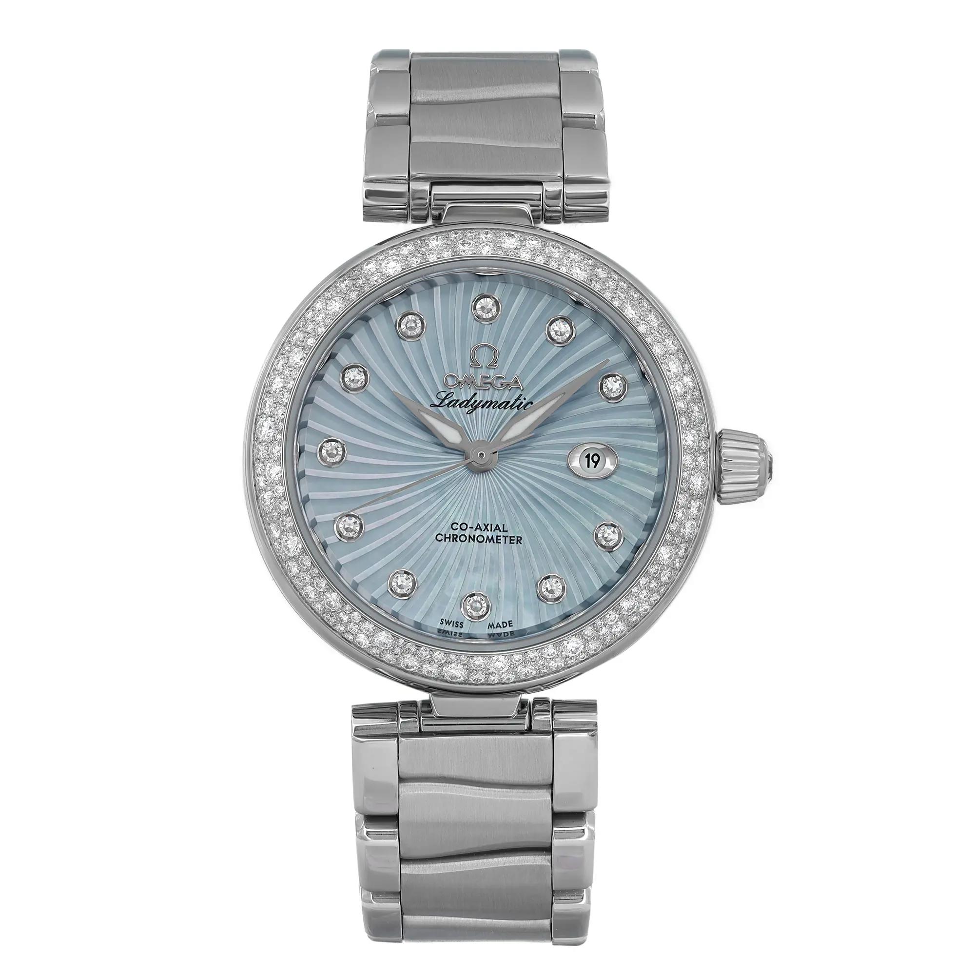 This Omega De Ville Ladymatic 425.35.34.20.57.002 has a blue diamond dial and a bracelet strap. This Omega has undergone a thorough inspection of accuracy, functionality and condition at our Omega certified service centre to determine the level of reconditioning required to meet our strict standards. It has also been checked against our records to ensure authenticity. All our watches have a 24-month warranty for your peace of mind.