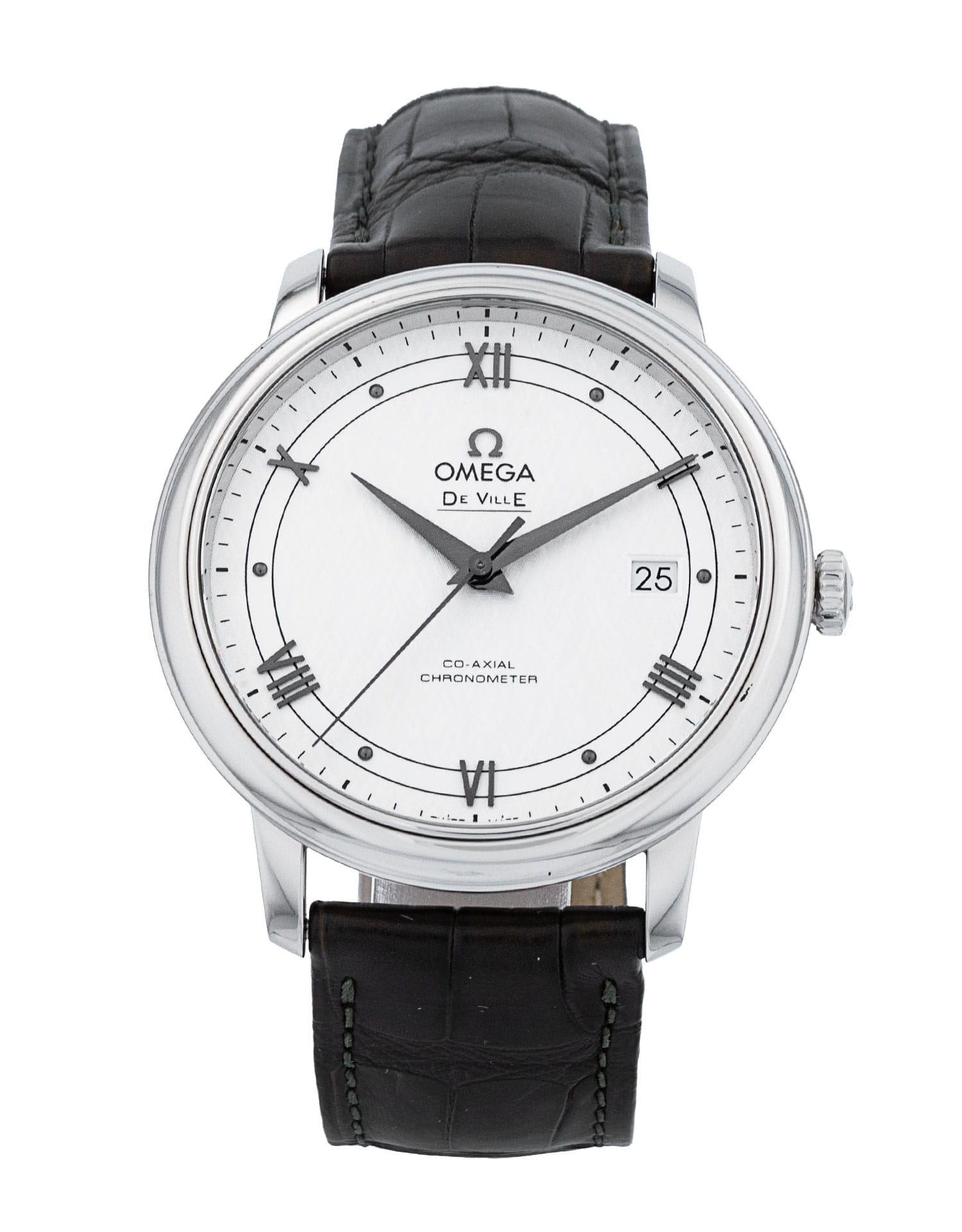 This Omega De Ville Prestige 424.13.40.20.02.006 has a silver roman numeral dial and a leather strap. This Omega has undergone a thorough inspection of accuracy, functionality and condition at our Omega certified service centre to determine the level of reconditioning required to meet our strict standards. It has also been checked against our records to ensure authenticity. All our watches have a 24-month warranty for your peace of mind.