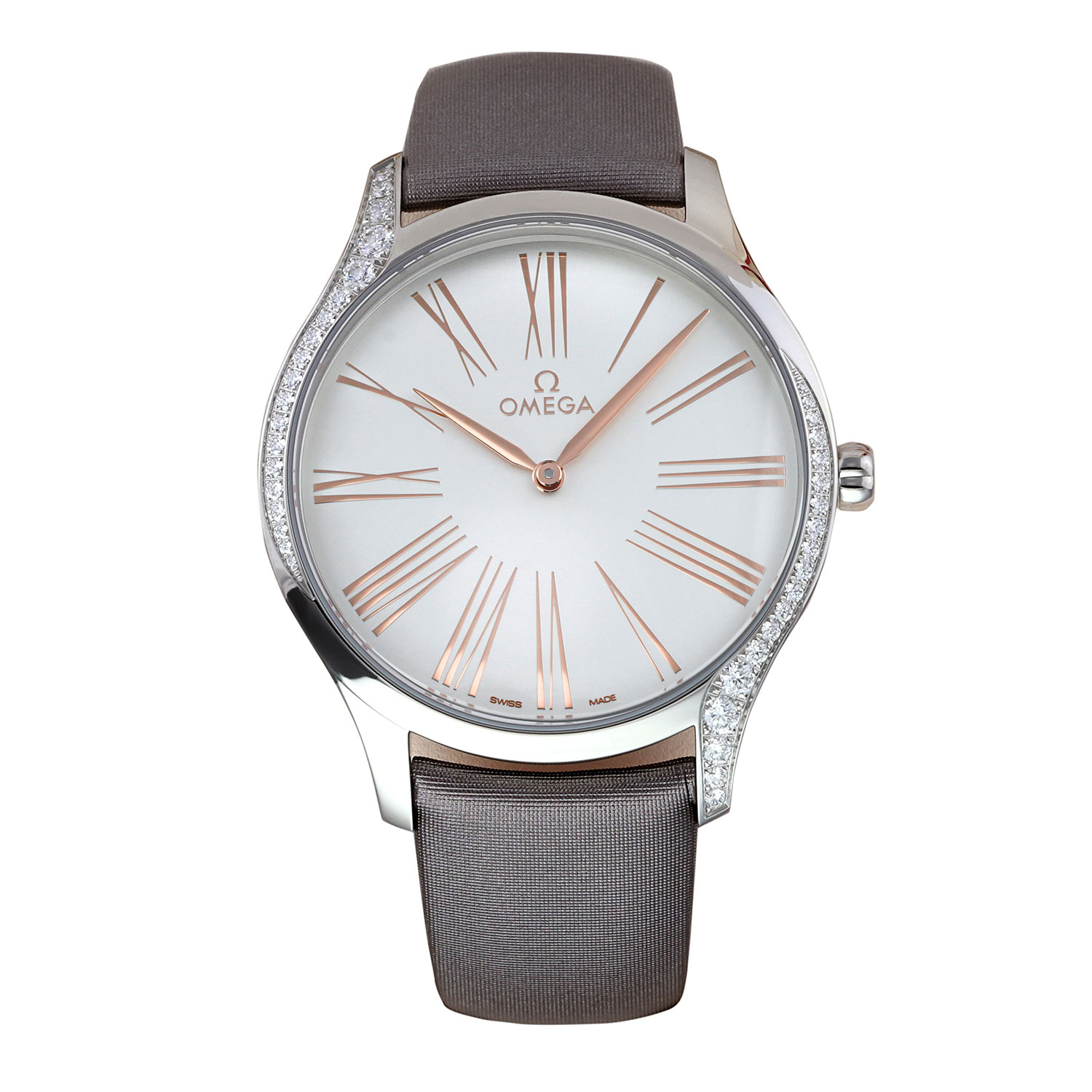 This Omega De Ville Tresor 428.17.39.60.02.001 has a silver roman numeral dial and a fabric strap. This Omega has undergone a thorough inspection of accuracy, functionality and condition at our Omega certified service centre to determine the level of reconditioning required to meet our strict standards. It has also been checked against our records to ensure authenticity. Our watches have a 24-month warranty for your peace of mind, in conjunction with any remaining manufacturer’s warranty from new or from service.