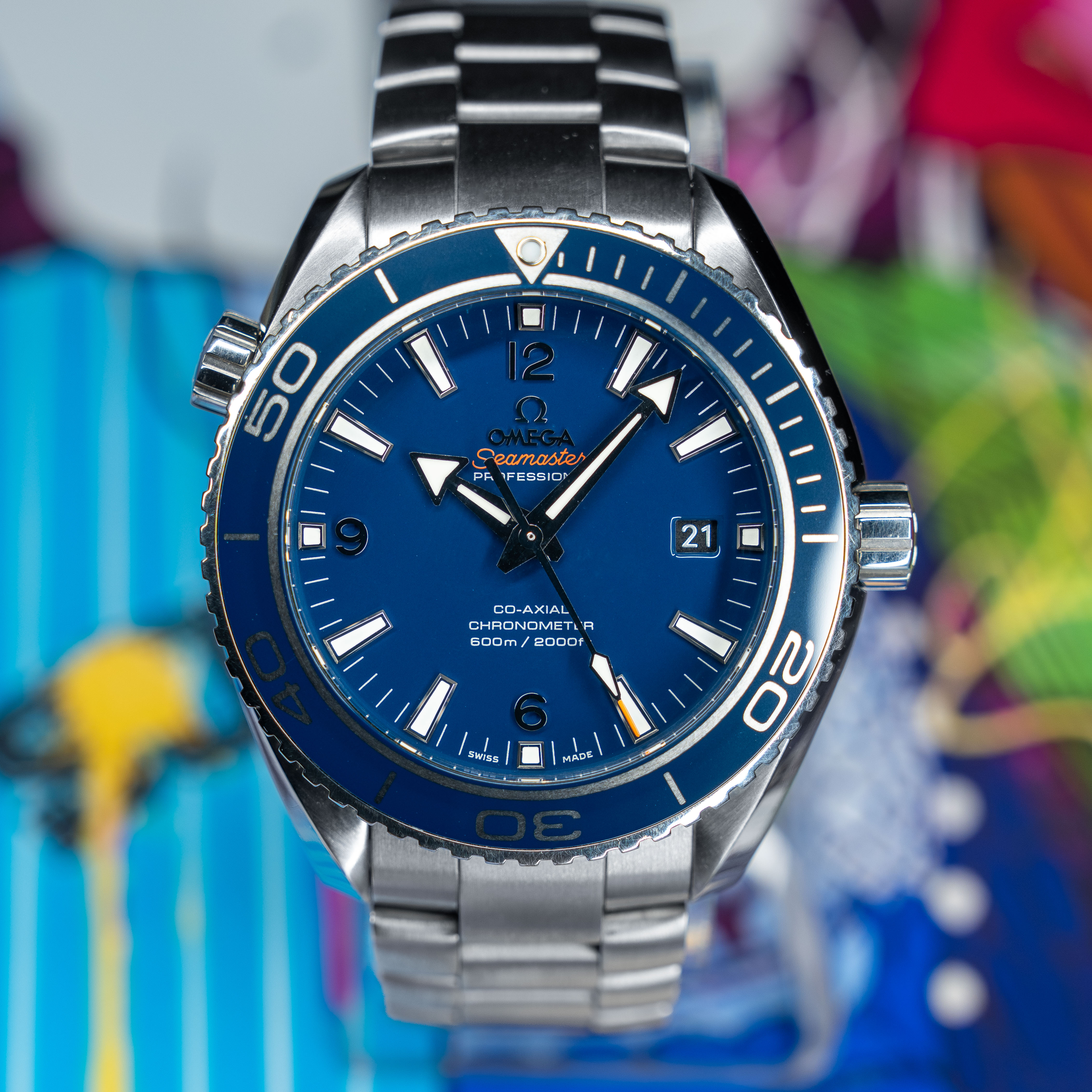 This Omega Planet Ocean 232.90.46.21.03.001 has a blue quarter arabic dial and a bracelet strap. This Omega has undergone a thorough inspection of accuracy, functionality and condition at our Omega certified service centre to determine the level of reconditioning required to meet our strict standards. It has also been checked against our records to ensure authenticity. All our watches have a 24-month warranty for your peace of mind.