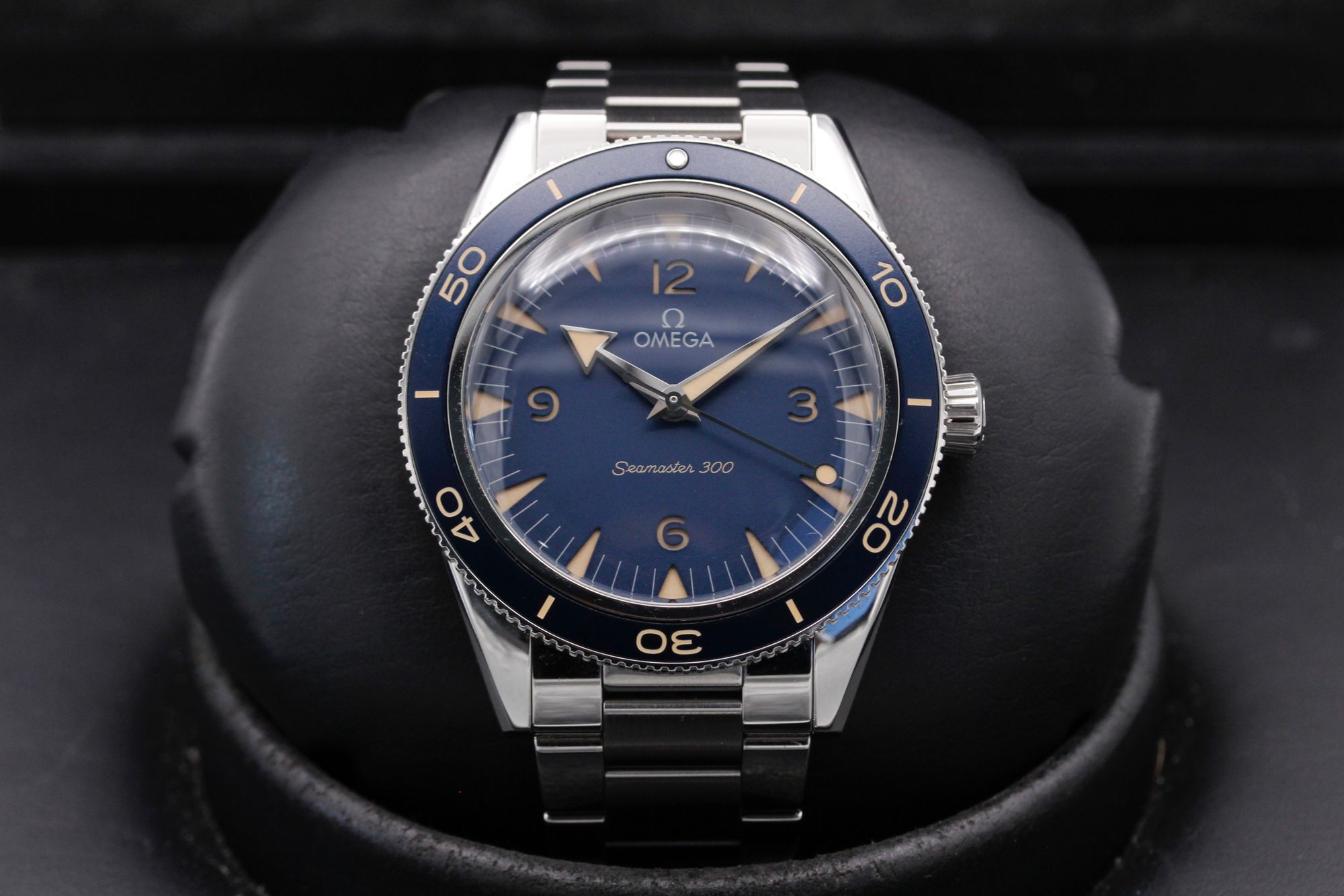 This Omega Seamaster 300 234.30.41.21.03.001 has a blue quarter arabic dial and a bracelet strap. This Omega has undergone a thorough inspection of accuracy, functionality and condition at our Omega certified service centre to determine the level of reconditioning required to meet our strict standards. It has also been checked against our records to ensure authenticity. All our watches have a 24-month warranty for your peace of mind.
