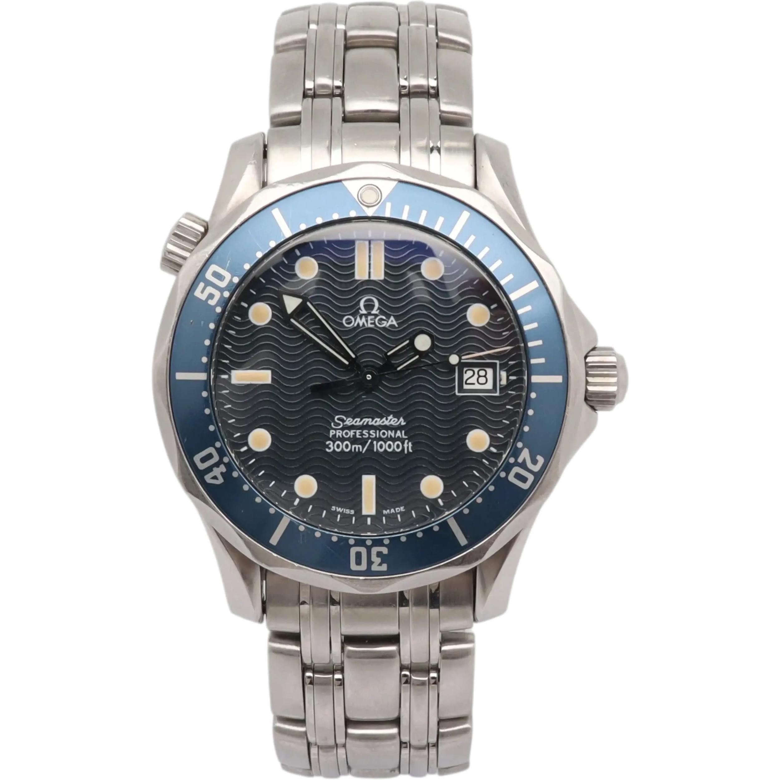 This Omega Seamaster 300m Mid-Size 2561.80.00 has a blue dial and a bracelet strap. This Omega has undergone a thorough inspection of accuracy, functionality and condition at our Omega certified service centre to determine the level of reconditioning required to meet our strict standards. It has also been checked against our records to ensure authenticity. All our watches have a 24-month warranty for your peace of mind.