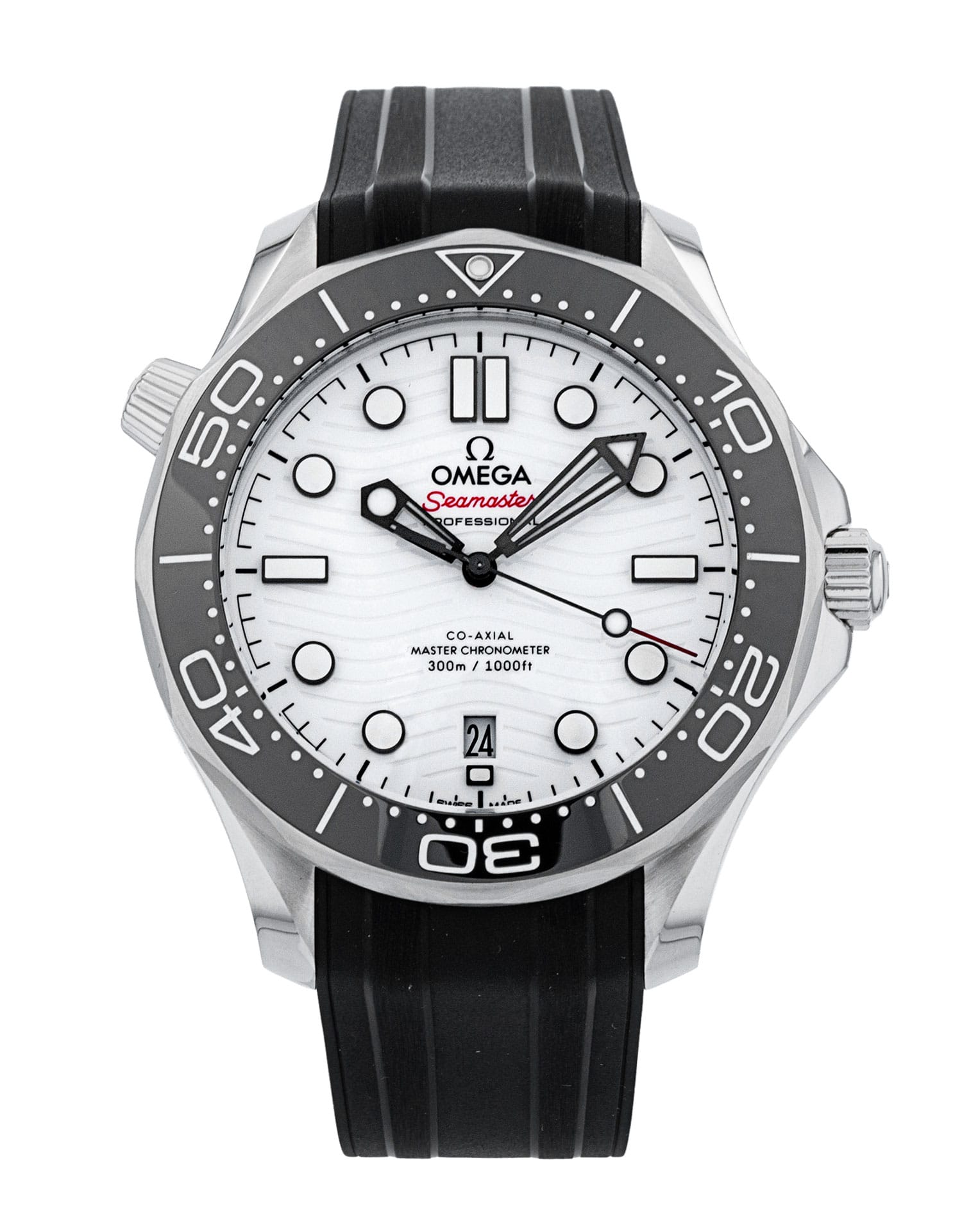 This Omega Seamaster Diver 300m 210.32.42.20.04.001 has a white dial and a rubber strap. This Omega has undergone a thorough inspection of accuracy, functionality and condition at our Omega certified service centre to determine the level of reconditioning required to meet our strict standards. It has also been checked against our records to ensure authenticity. All our watches have a 24-month warranty for your peace of mind.