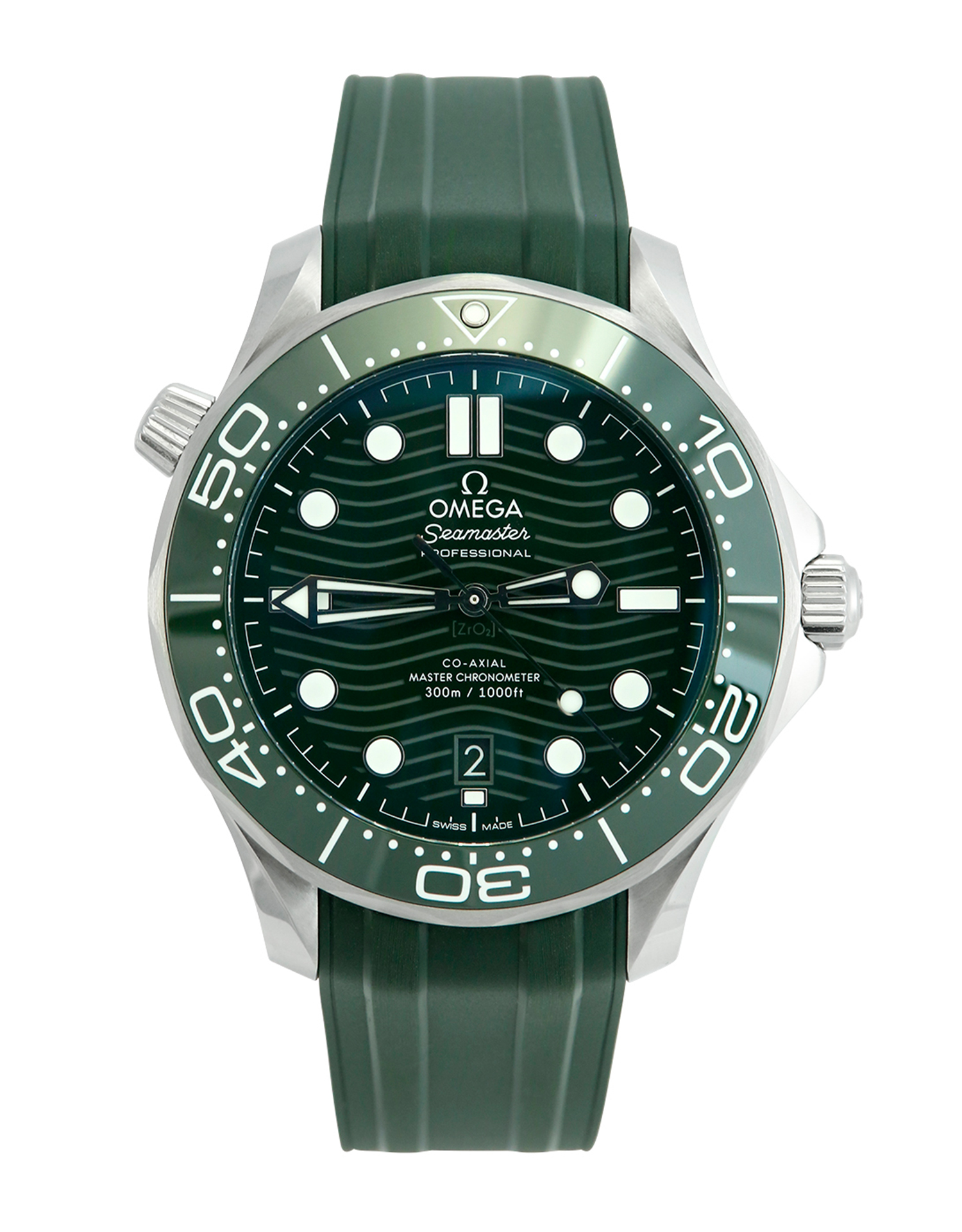 This Omega Seamaster Diver 300m 210.32.42.20.10.001 has a green dial and a rubber strap. This Omega has undergone a thorough inspection of accuracy, functionality and condition at our Omega certified service centre to determine the level of reconditioning required to meet our strict standards. It has also been checked against our records to ensure authenticity. Our watches have a 24-month warranty for your peace of mind, in conjunction with any remaining manufacturer’s warranty from new or from service.