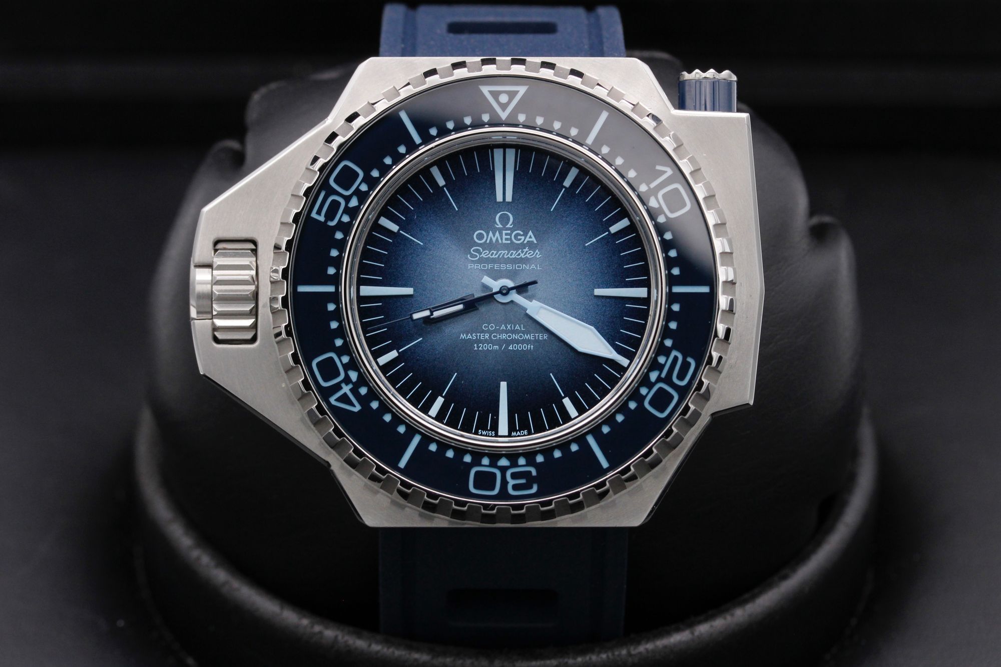 This Omega Seamaster Ploprof 1200m 227.32.55.21.03.001 has a blue dial and a rubber strap. This Omega has undergone a thorough inspection of accuracy, functionality and condition at our Omega certified service centre to determine the level of reconditioning required to meet our strict standards. It has also been checked against our records to ensure authenticity. Our watches have a 24-month warranty for your peace of mind, in conjunction with any remaining manufacturer’s warranty from new or from service.