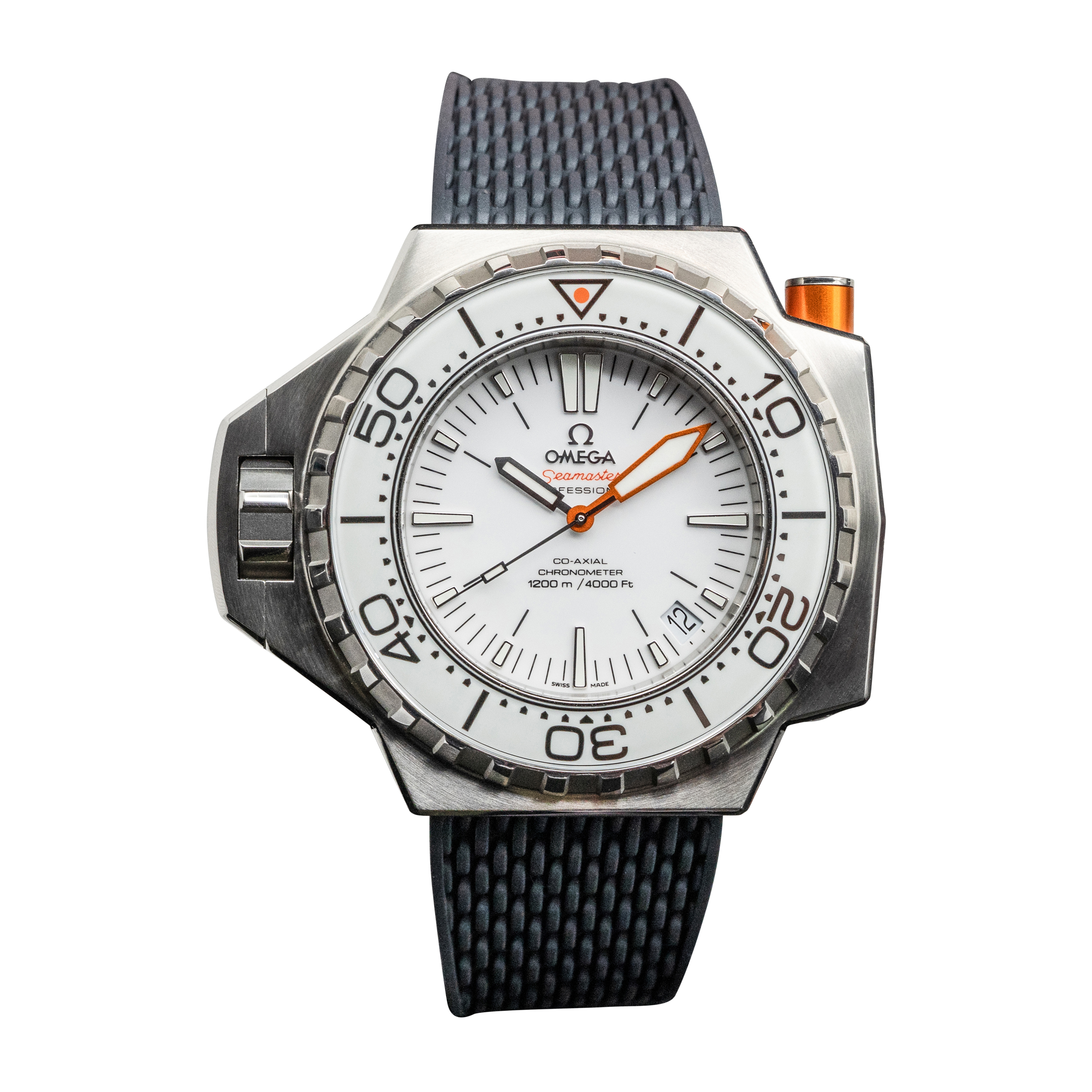 This Omega Seamaster Ploprof 224.32.55.21.04.001 has a white dial and a rubber strap. This Omega has undergone a thorough inspection of accuracy, functionality and condition at our Omega certified service centre to determine the level of reconditioning required to meet our strict standards. It has also been checked against our records to ensure authenticity. All our watches have a 24-month warranty for your peace of mind.