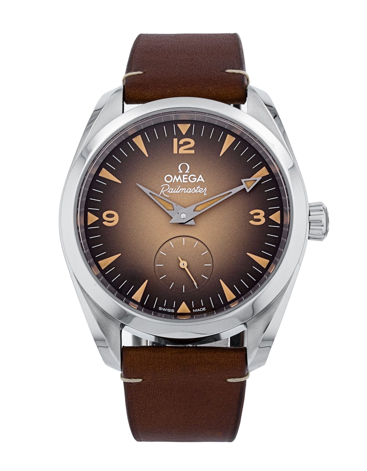 This Omega Seamaster Railmaster 235.10.38.20.13.001 has a brown quarter arabic dial and a leather strap. This Omega has undergone a thorough inspection of accuracy, functionality and condition at our Omega certified service centre to determine the level of reconditioning required to meet our strict standards. It has also been checked against our records to ensure authenticity. Our watches have a 24-month warranty for your peace of mind, in conjunction with any remaining manufacturer’s warranty from new or from service.