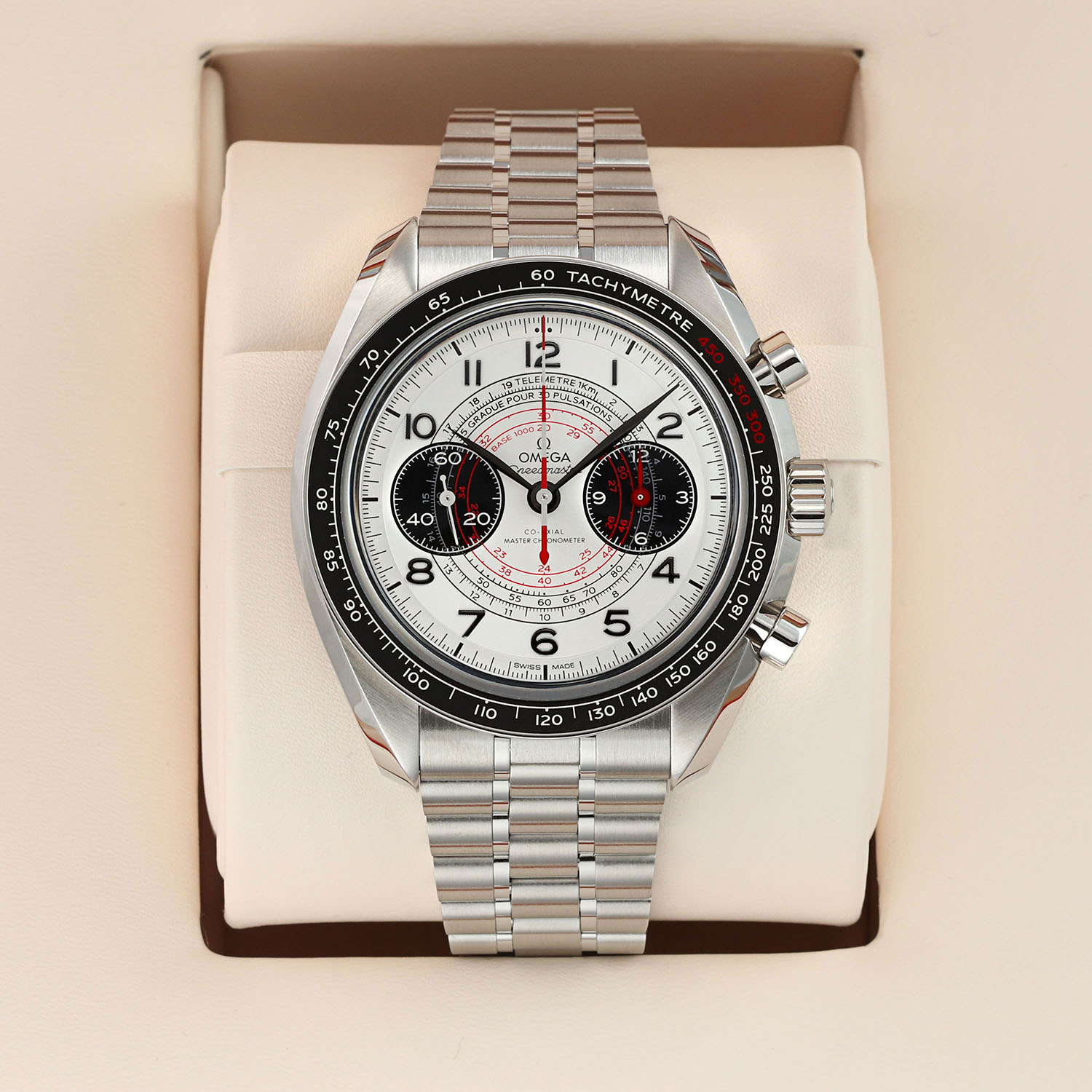 This Omega Speedmaster Chronoscope 329.30.43.51.02.002 has a silver arabic dial and a bracelet strap. This Omega has undergone a thorough inspection of accuracy, functionality and condition at our Omega certified service centre to determine the level of reconditioning required to meet our strict standards. It has also been checked against our records to ensure authenticity. Our watches have a 24-month warranty for your peace of mind, in conjunction with any remaining manufacturer’s warranty from new or from service.