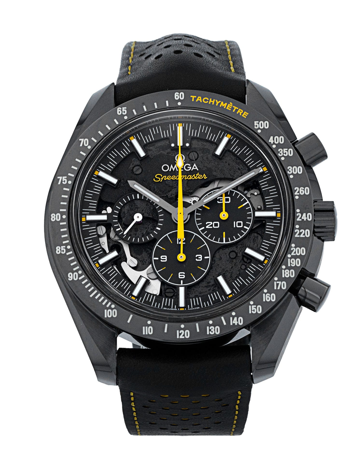 This Omega Speedmaster Dark Side of the Moon 311.92.44.30.01.001 has a black dial and a leather strap. This Omega has undergone a thorough inspection of accuracy, functionality and condition at our Omega certified service centre to determine the level of reconditioning required to meet our strict standards. It has also been checked against our records to ensure authenticity. All our watches have a 24-month warranty for your peace of mind.