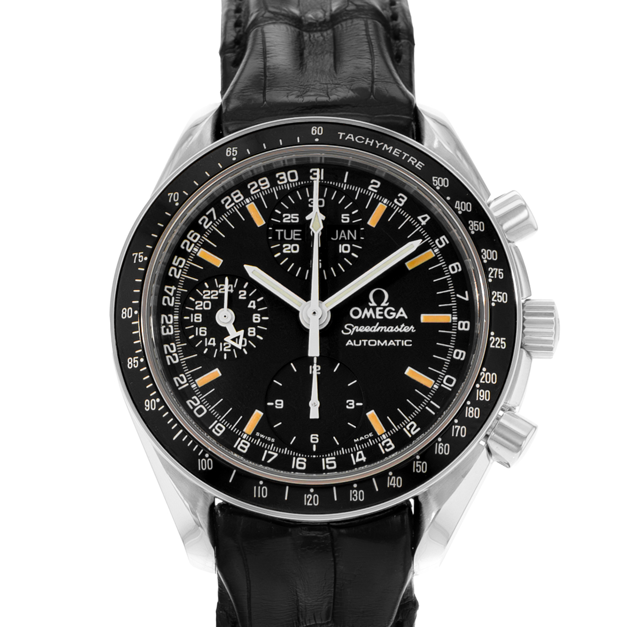 This Omega Speedmaster DayDate 3520.50.00 has a black baton dial and a leather strap. This Omega has undergone a thorough inspection of accuracy, functionality and condition at our Omega certified service centre to determine the level of reconditioning required to meet our strict standards. It has also been checked against our records to ensure authenticity. All our watches have a 24-month warranty for your peace of mind.