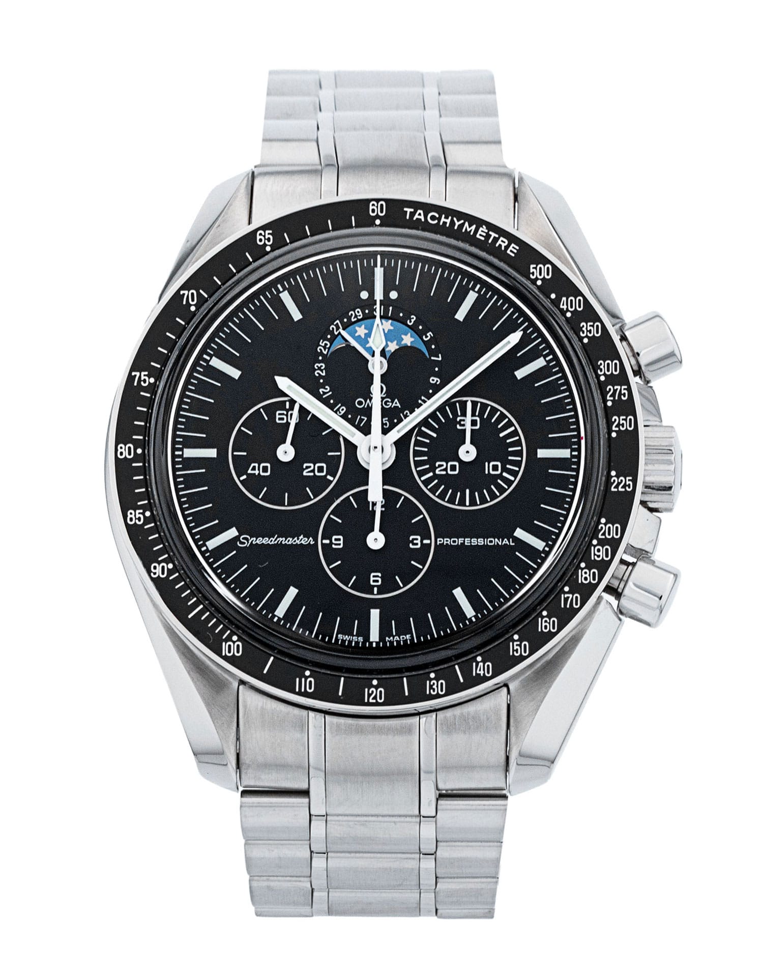 This Omega Speedmaster Moonphase 3876.50.31 has a black baton dial and a bracelet strap. This Omega has undergone a thorough inspection of accuracy, functionality and condition at our Omega certified service centre to determine the level of reconditioning required to meet our strict standards. It has also been checked against our records to ensure authenticity. All our watches have a 24-month warranty for your peace of mind.