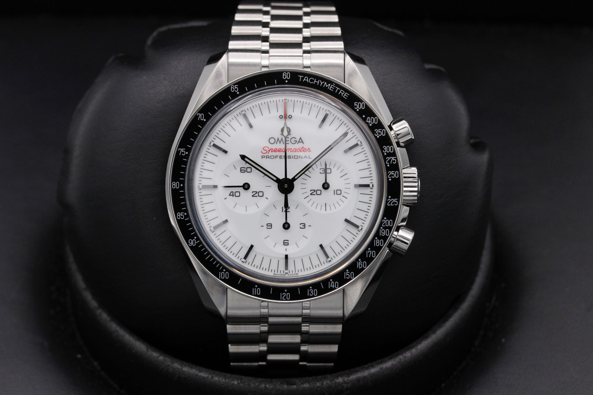 This Omega Speedmaster Moonwatch Professional 310.30.42.50.04.001 has a white baton dial and a bracelet strap. This Omega has undergone a thorough inspection of accuracy, functionality and condition at our Omega certified service centre to determine the level of reconditioning required to meet our strict standards. It has also been checked against our records to ensure authenticity. Our watches have a 24-month warranty for your peace of mind, in conjunction with any remaining manufacturer’s warranty from new or from service.