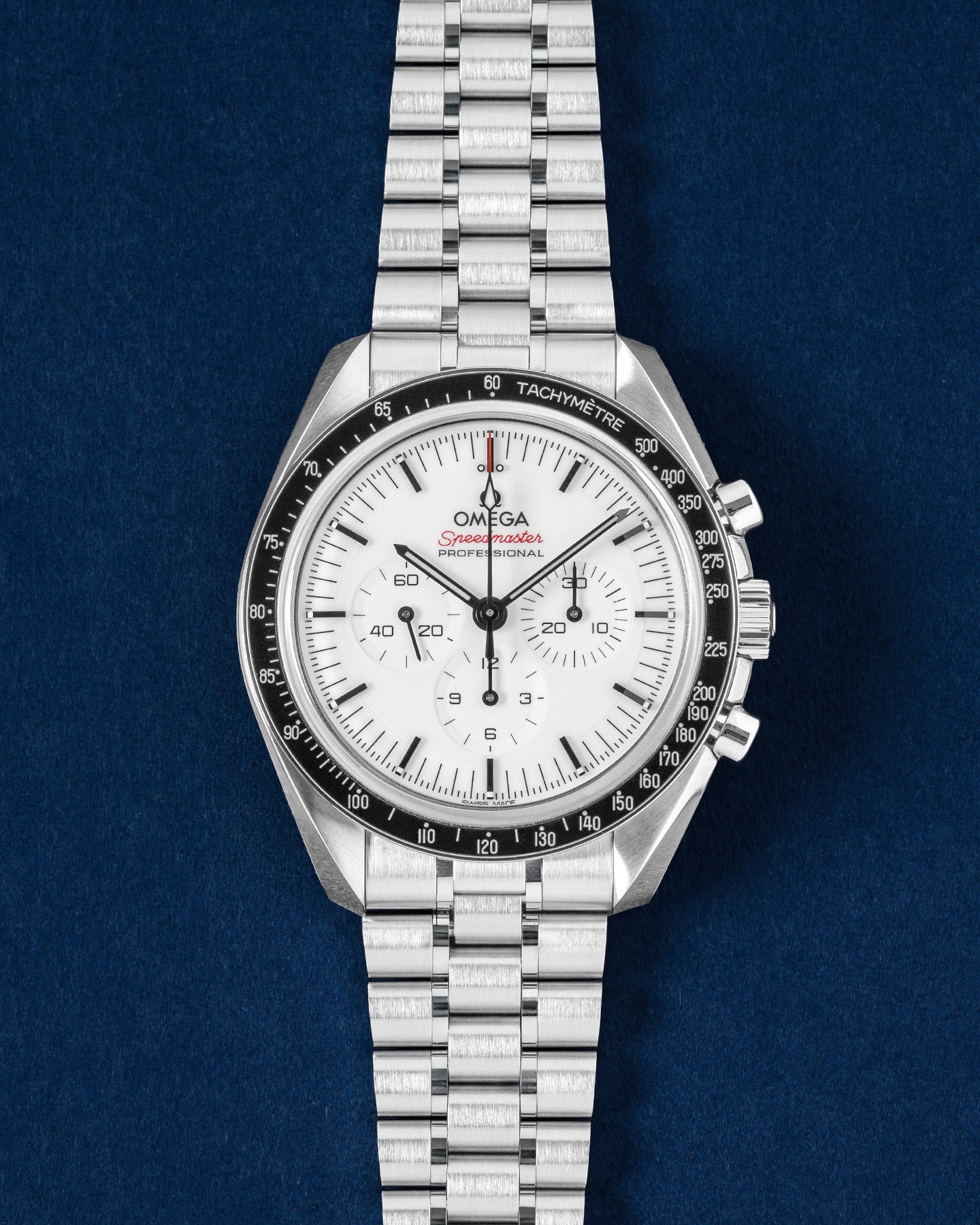 This Omega Speedmaster Moonwatch Professional 310.30.42.50.04.001 has a white baton dial and a bracelet strap. This Omega has undergone a thorough inspection of accuracy, functionality and condition at our Omega certified service centre to determine the level of reconditioning required to meet our strict standards. It has also been checked against our records to ensure authenticity. Our watches have a 24-month warranty for your peace of mind, in conjunction with any remaining manufacturer’s warranty from new or from service.