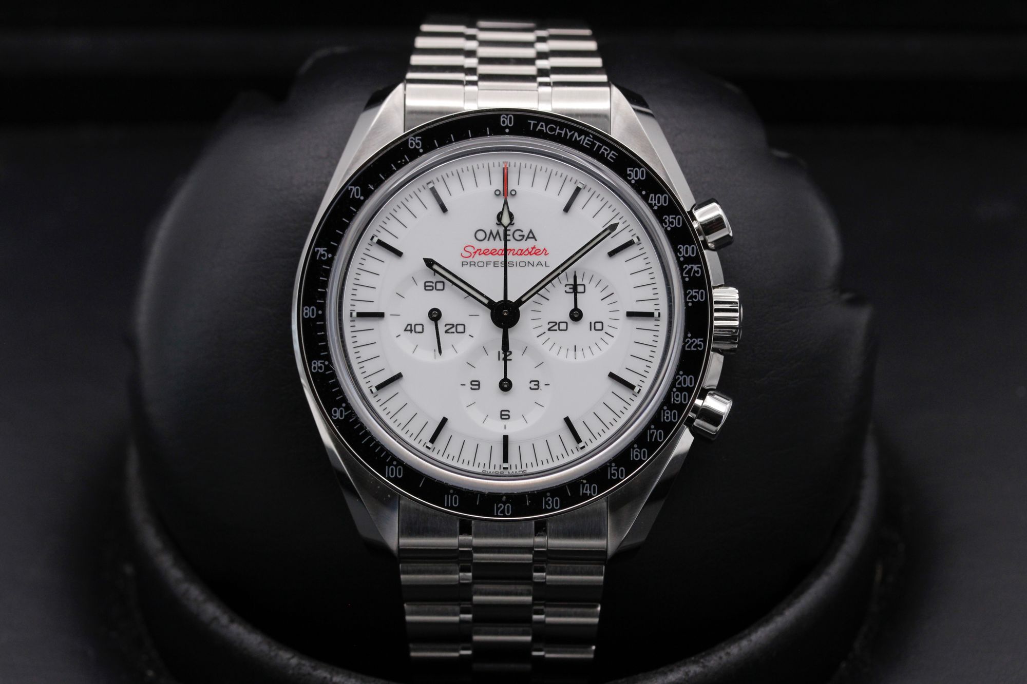 This Omega Speedmaster Moonwatch Professional 310.30.42.50.04.001 has a white baton dial and a bracelet strap. This Omega has undergone a thorough inspection of accuracy, functionality and condition at our Omega certified service centre to determine the level of reconditioning required to meet our strict standards. It has also been checked against our records to ensure authenticity. Our watches have a 24-month warranty for your peace of mind, in conjunction with any remaining manufacturer’s warranty from new or from service.