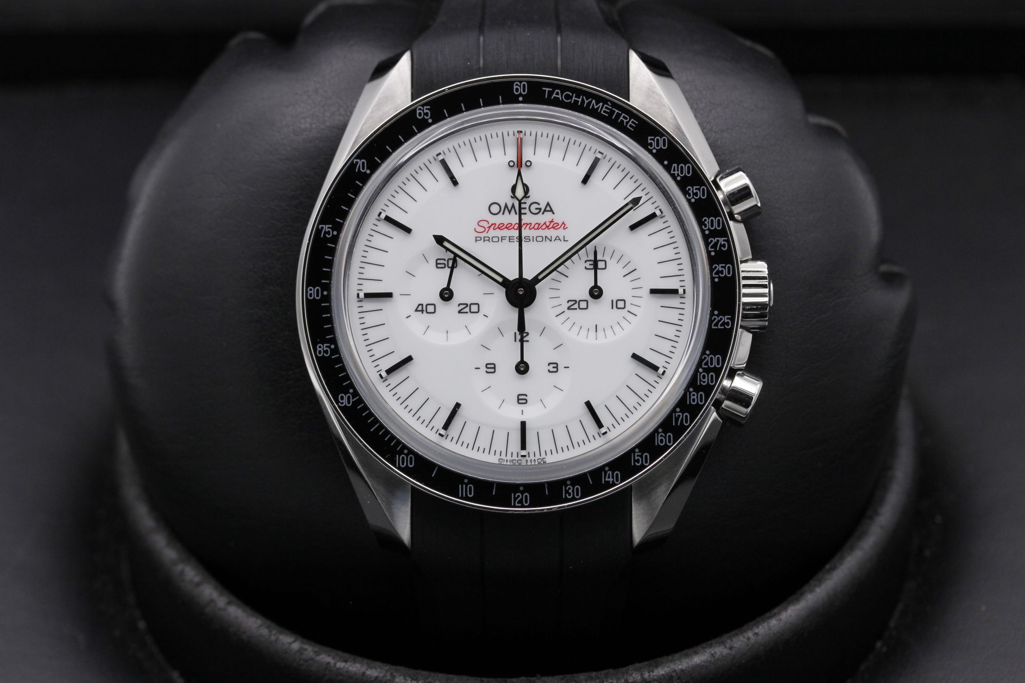 This Omega Speedmaster Moonwatch Professional 310.32.42.50.04.001 has a white dial and a rubber strap. This Omega has undergone a thorough inspection of accuracy, functionality and condition at our Omega certified service centre to determine the level of reconditioning required to meet our strict standards. It has also been checked against our records to ensure authenticity. Our watches have a 24-month warranty for your peace of mind, in conjunction with any remaining manufacturer’s warranty from new or from service.