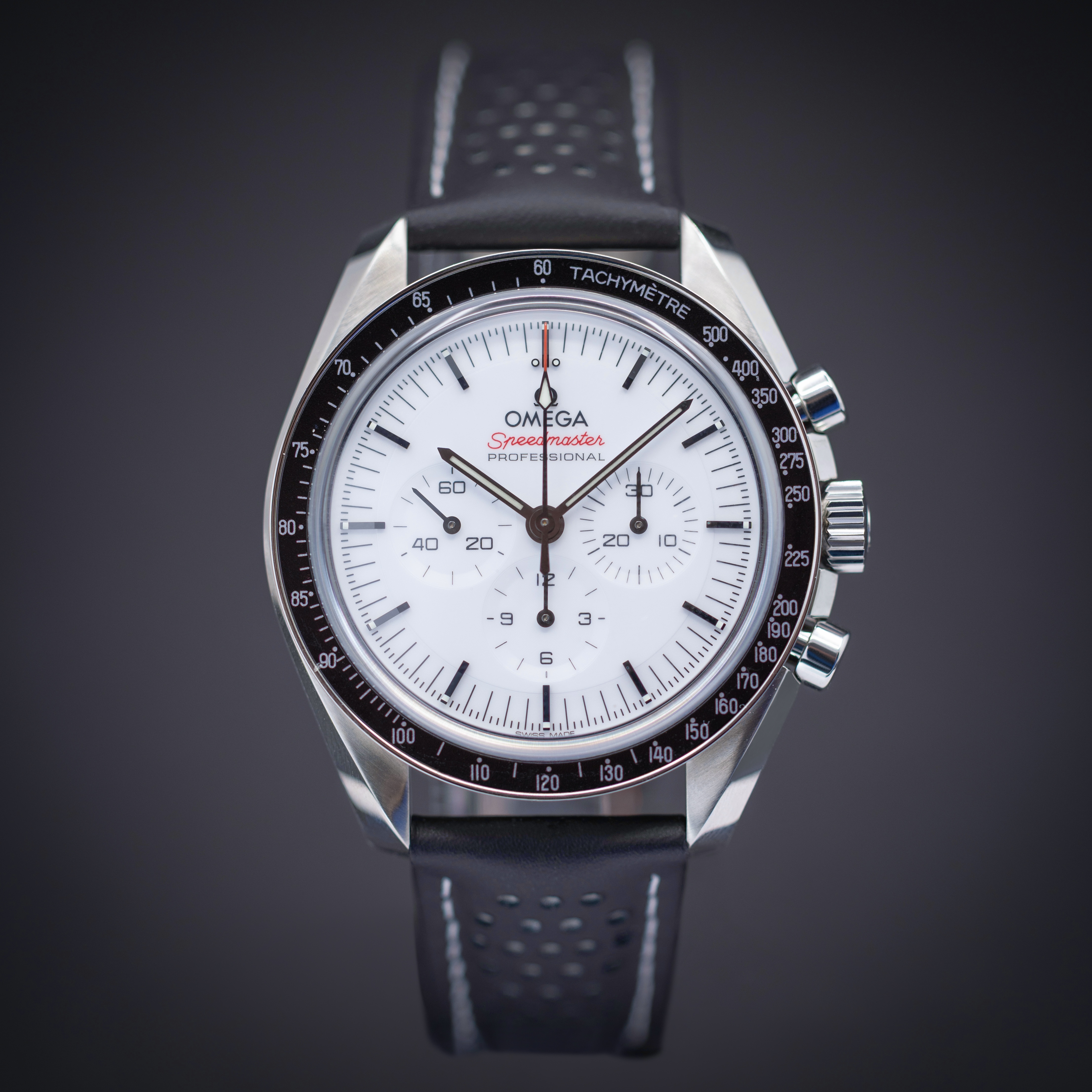 This Omega Speedmaster Moonwatch Professional 310.32.42.50.04.002 has a white dial and a leather strap. This Omega has undergone a thorough inspection of accuracy, functionality and condition at our Omega certified service centre to determine the level of reconditioning required to meet our strict standards. It has also been checked against our records to ensure authenticity. Our watches have a 24-month warranty for your peace of mind, in conjunction with any remaining manufacturer’s warranty from new or from service.