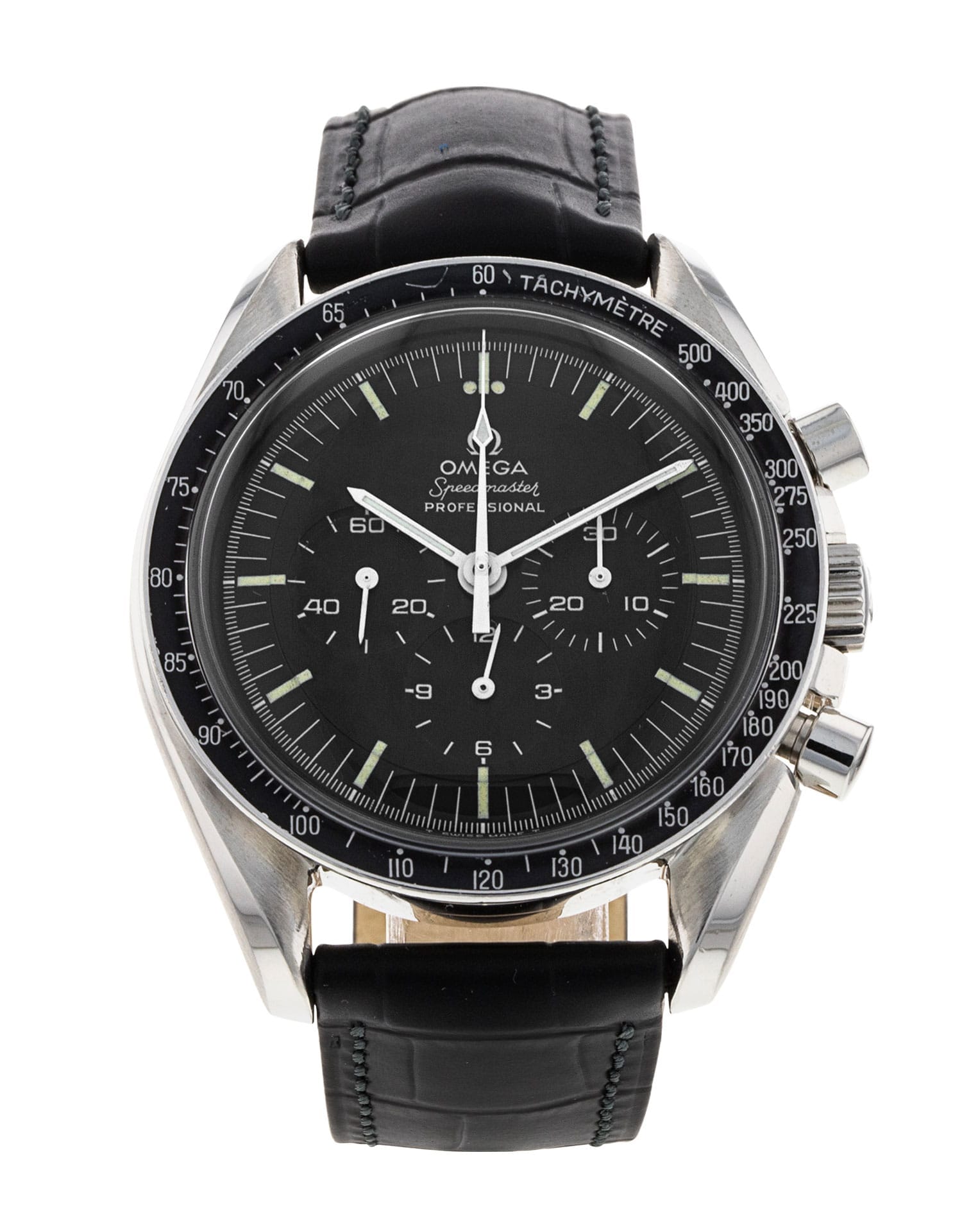 This Omega Speedmaster Moonwatch 145022.69 ST has a black baton dial and a leather strap. This Omega has undergone a thorough inspection of accuracy, functionality and condition at our Omega certified service centre to determine the level of reconditioning required to meet our strict standards. It has also been checked against our records to ensure authenticity. All our watches have a 24-month warranty for your peace of mind.