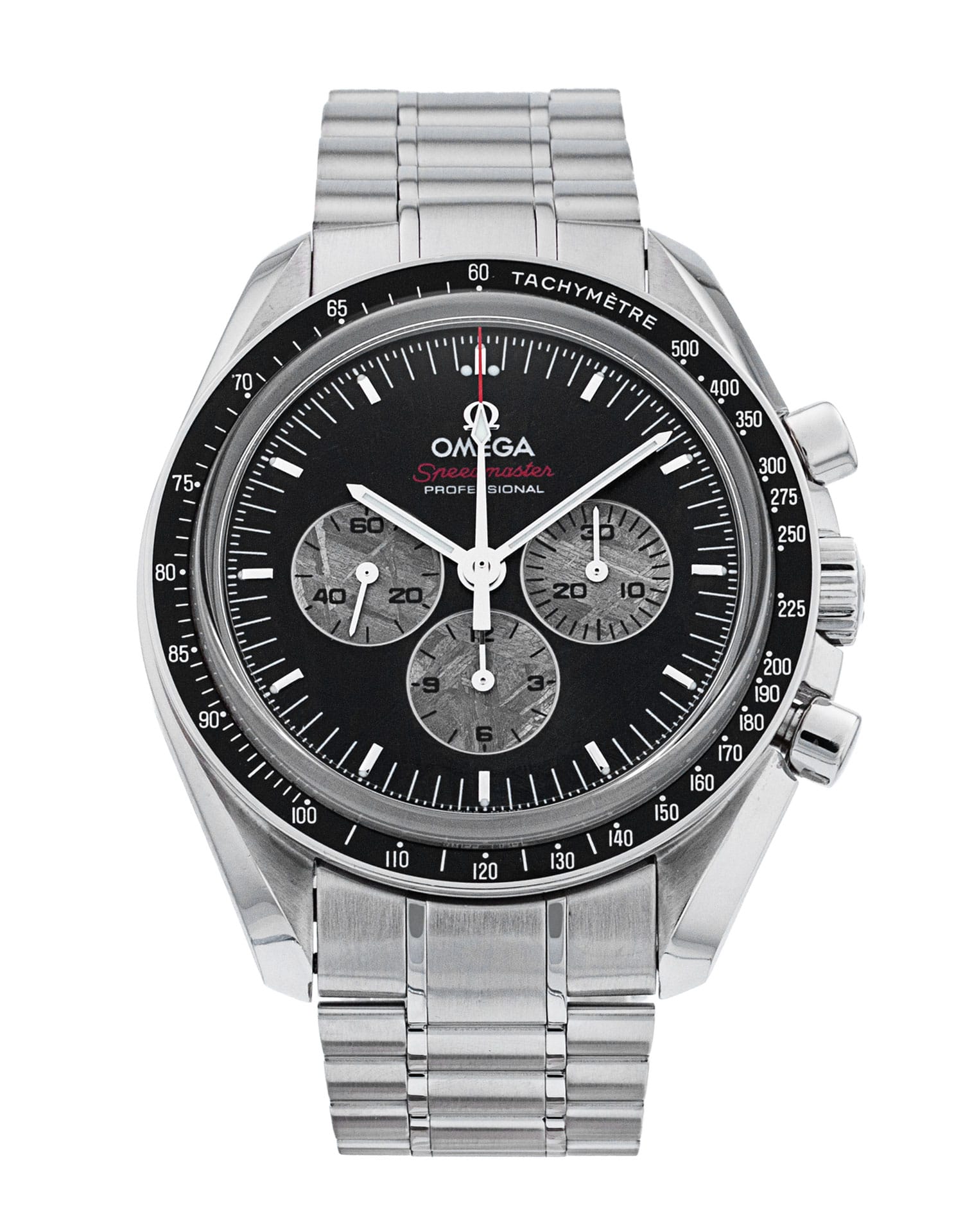 On July 17th, 1975, two spacecraft met in an alliance of nations between America and Russia - the Apollo-Soyuz Test Project. This cooperation led to the creation of a permanently manned space station and was also the last ever NASA Apollo mission. The Apollo-Soyuz 35th Anniversary Speedmaster commemorates the occasion, as well as the Speedmasters worn by Lt. Gen. Stafford and Lt. Gen. Leonov during their historical meeting, and is a limited edition of 1,975. Each watch, however, is completely unique, because the dials are made from slices meteorite, with no two alike. The crystalline surface takes on a dark colour as a result of a surface oxidation process, and the subdials are polished to the meteorite's non-oxidised colour.