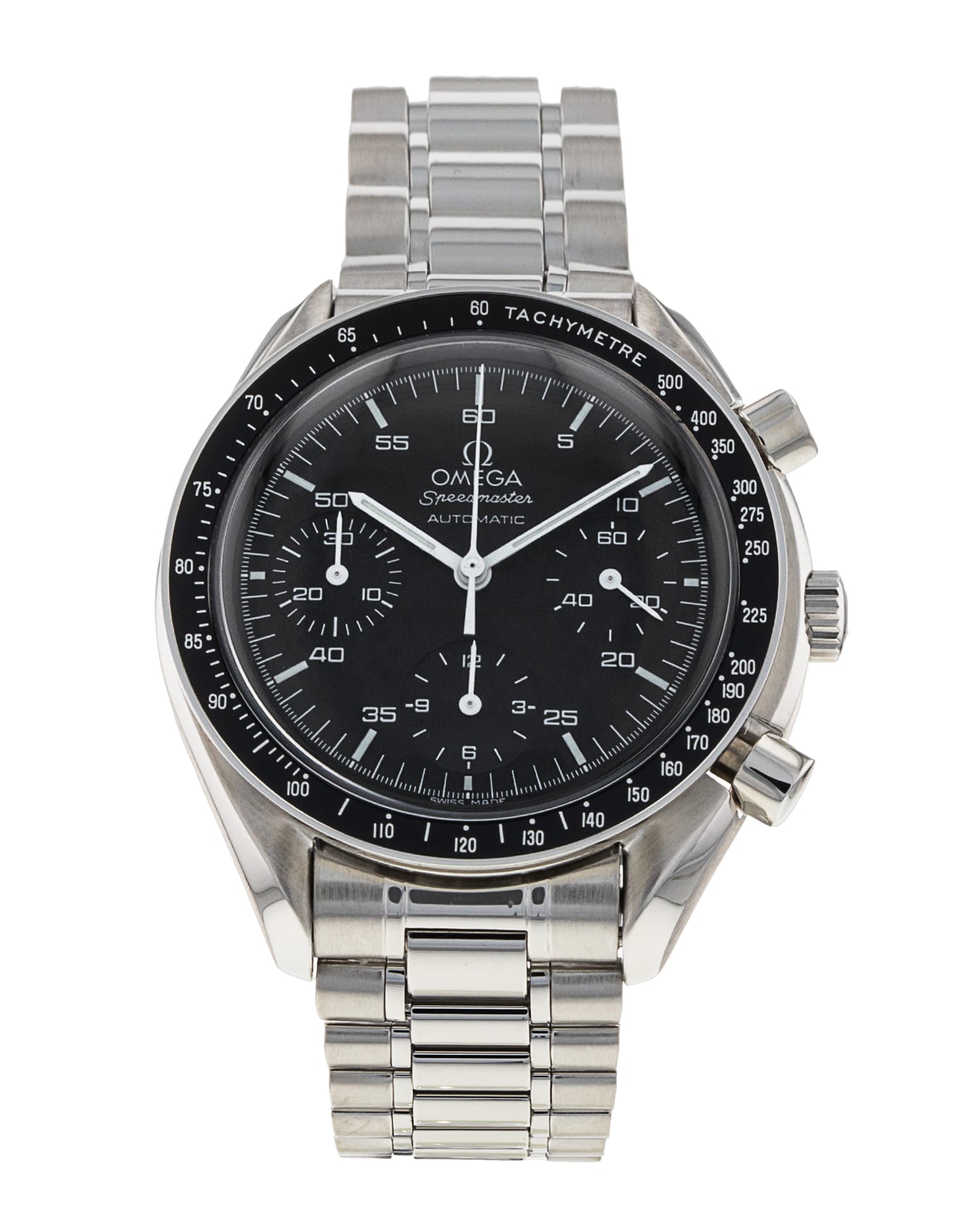 This Omega Speedmaster Reduced 3510.50.00 has a black baton dial and a bracelet strap. This Omega has undergone a thorough inspection of accuracy, functionality and condition at our Omega certified service centre to determine the level of reconditioning required to meet our strict standards. It has also been checked against our records to ensure authenticity. All our watches have a 24-month warranty for your peace of mind.