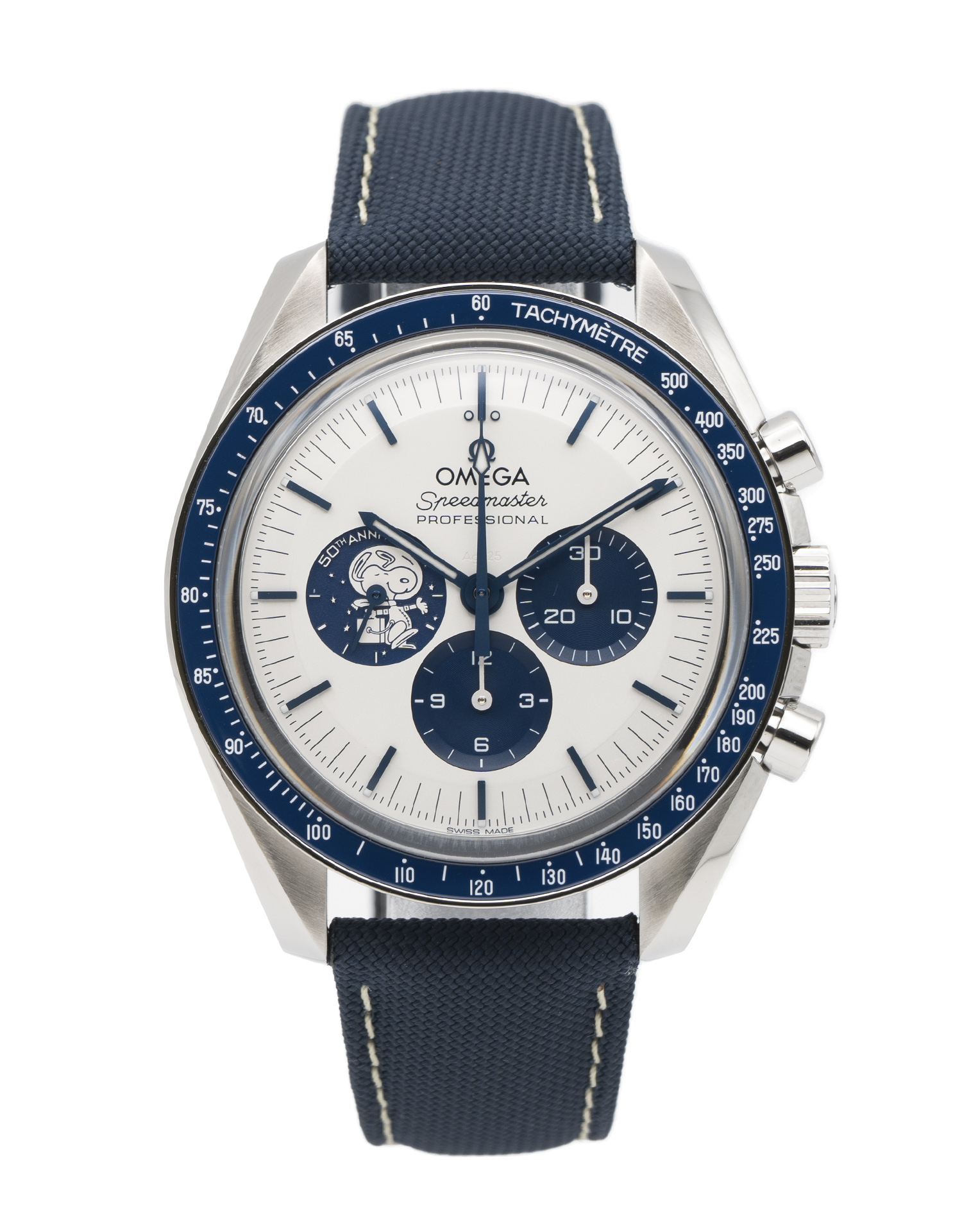 This Omega Speedmaster Snoopy 311.32.42.30.04.003 has a white baton dial and a fabric strap. This Omega has undergone a thorough inspection of accuracy, functionality and condition at our Omega certified service centre to determine the level of reconditioning required to meet our strict standards. It has also been checked against our records to ensure authenticity. Our watches have a 24-month warranty for your peace of mind, in conjunction with any remaining manufacturer’s warranty from new or from service.
